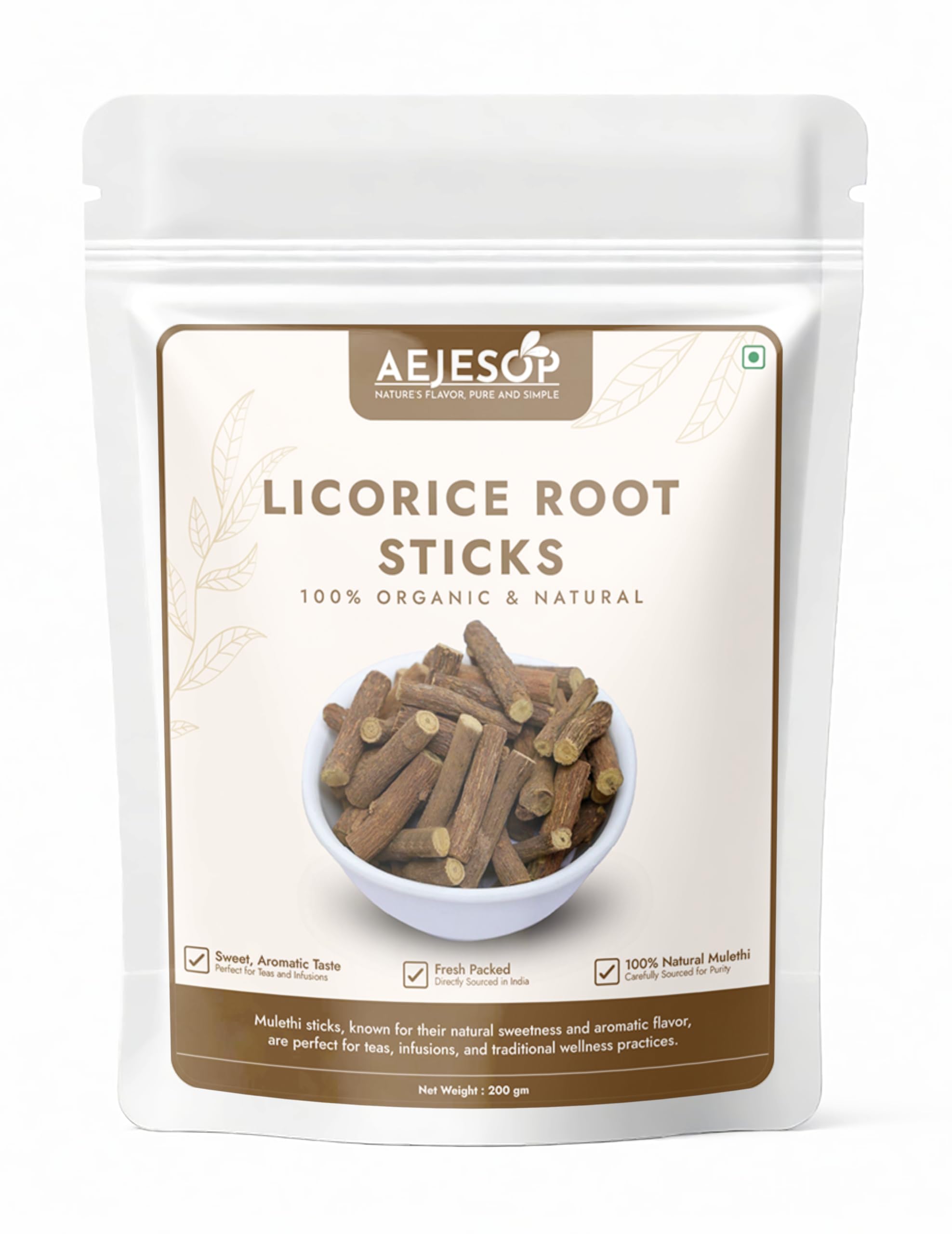 AEJESOP Licorice Root Sticks is a natural expectorant and cough suppressant, suitable for both adults and children to soothe throat irritation and alleviate cold symptoms. It is known as 'mulethi' in Ayurveda, licorice root aids in promoting healthy digestion by balancing stomach acidity, lubricating the gut, and eg discomfort.