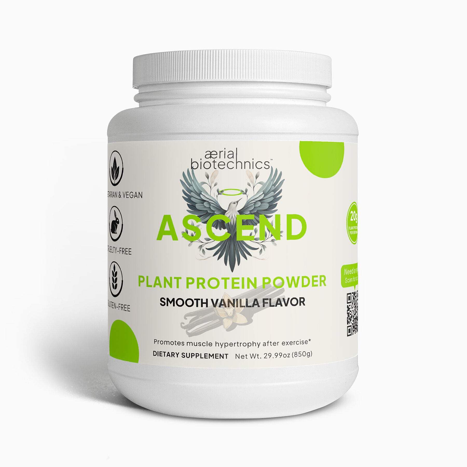 Enhance your nutrition with our ASCEND Plant Protein (Vanilla), a delicious and versatile protein powder designed to support your active lifestyle. Each serving provides a complete amino acid profile essential for muscle repair and growth, making it an ideal post-workout recovery shake. Made from high-quality plant-based ingredients, our formula is free from dairy, soy, and gluten, ensuring it's suitable for those with dietary restrictions. Enjoy the smooth, creamy vanilla flavor in your favorite beverages, smoothies, or recipes. Embrace a healthier protein option that supports both your wellness goals and the environment. Health Benefits: High-Quality Plant Protein: Each serving delivers 20g of a powerful blend of Tendra Fava Bean Protein Isolate and YESTEINTM Fermented Nutritional Yeast Protein to support muscle recovery and growth. Low-Calorie and Nutrient-Dense: Each serving contains just 110 kcal and provides all essential amino acids necessary for muscle repair and growth, along with apple pectin powder for added digestive support. Smooth Vanilla Flavor with Healthy Fats: Enjoy the creamy vanilla taste enhanced with MCT oil powder for quick energy and metabolism. Weight Management: The combination of protein and fiber helps increase feelings of fullness, aiding in weight management. Allergen-Friendly and Digestive Health: Free from dairy, soy, and gluten, making it suitable for those with dietary restrictions, and includes sunflower lecithin for enhanced mixability and brain health. Ingredients: Tendra Fava Bean Protein Isolate, Natural Flavors, YESTEINTM Fermented Nutritional Yeast Protein, MCT Oil Powder, Apple Pectin Powder, Sea Salt, Stevia Extract (leaf), Silicon Dioxide. Flavor: Vanilla Manufacturer's country: USA Product amount: 29.77 oz. 844g Gross weight: 2lb 910g Suggested use: As a dietary supplement, adults mix two (2) scoops with 6-8 oz. of water or favorite beverage daily. For best results, take 20-30 minutes before a meal with 8 oz. of water or as directed by your healthcare professional. Caution: Do not exceed recommended dose. Pregnant or nursing mothers, children under the age of 18, and individuals with a known medical condition should consult a physician before using this or any dietary supplement. KEEP OUT OF THE REACH OF CHILDREN. DO NOT USE IF SAFETY SEAL IS DAMAGED OR MISSING. STORE IN A COOL, DRY PLACE. These statements have not been evaluated by the Food and Drug Administration. This product is not intended to diagnose, treat, cure or prevent any disease. Gluten Free Vegetarian Lactose Free Non-GMO VeganPremium Plant-Based Protein: Ascend Plant Protein delivers a smooth, delicious vanilla flavor with 20g of high-quality, plant-based protein per serving.