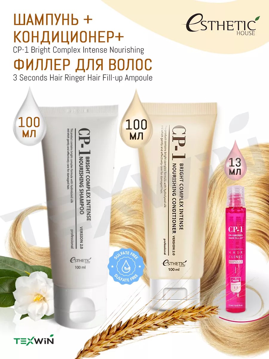 В каждом комплекте шампунь с кондиционером ESTHETIC HOUSE Virsion 2.0 и филлер 13 мл - Корейский шампунь для волос протеиновый и кондиционер Bright Complex Intense Nourishing это уход и комплексное восстановление от корней до самых кончиков. - Безсульфатный комплекс из белков, масел, коллагена и экстрактов растений отлично очищает волосы, питает их, делает эластичными, увлажняет, а также обволакивает волос, защищает от внешнего агрессивного воздействия.- Делает волосы шелковистыми. Кондиционер с протеинами и коллагеном для интенсивного питания волос, разработан для использования в салонах и домашнего ухода.- Кондиционер действует сразу в двух направлениях: дает моментальный видимый результат и восстанавливает структуру каждого волоска изнутри на клеточном уровне.