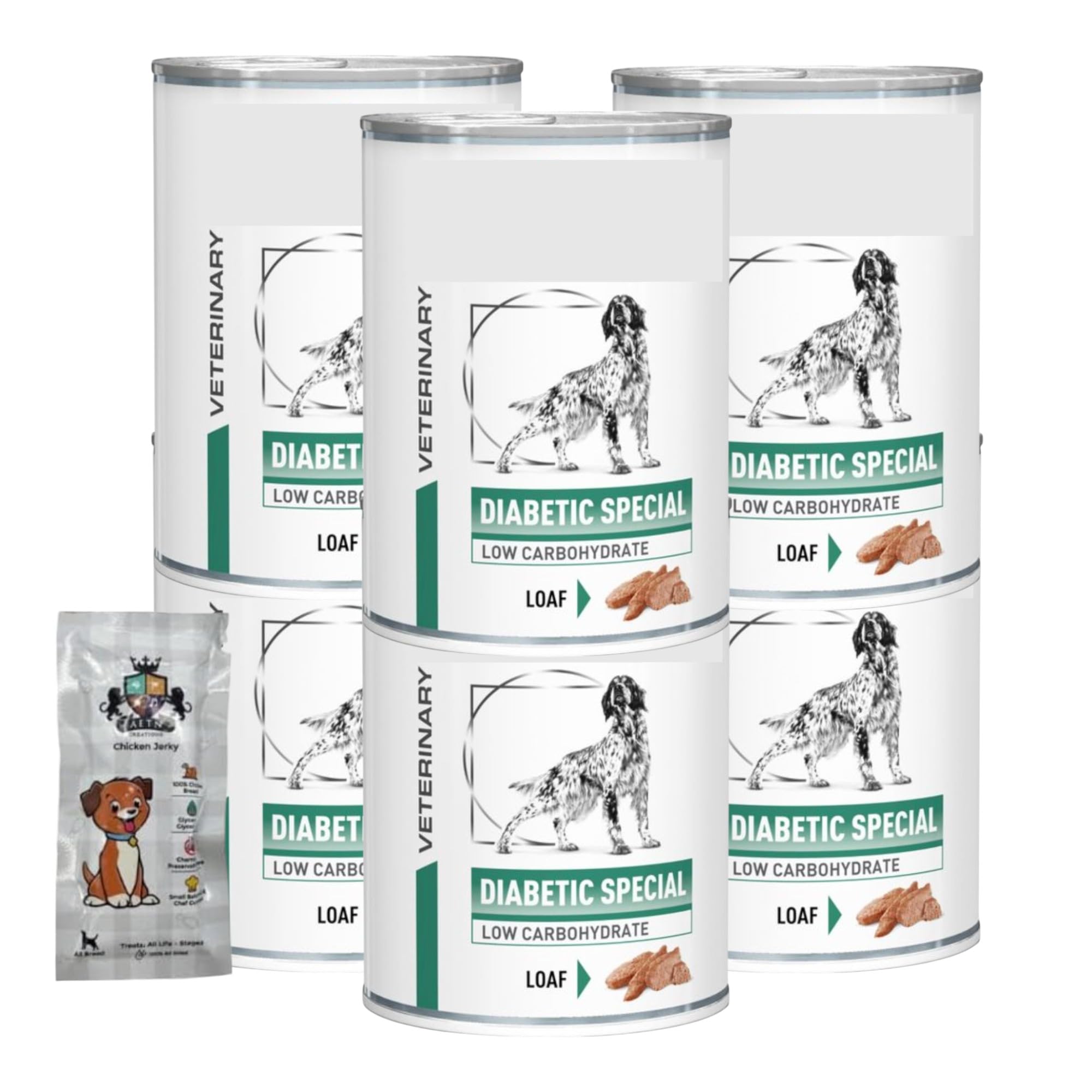 Jerky Treats: Grain-free jerky treats designed for diabetic dogs as a healthy snack. Fibre-Rich: Enriched with fibre to aid in blood sugar regulation. Low-Fat Protein: High-quality proteins and low fat to maintain healthy weight. Bundle Pack: Includes 6 tins (410g each) of wet diabetic dog food and jerky treats. Diabetic Formulation: Specially formulated wet dog food to support dogs with diabetes.