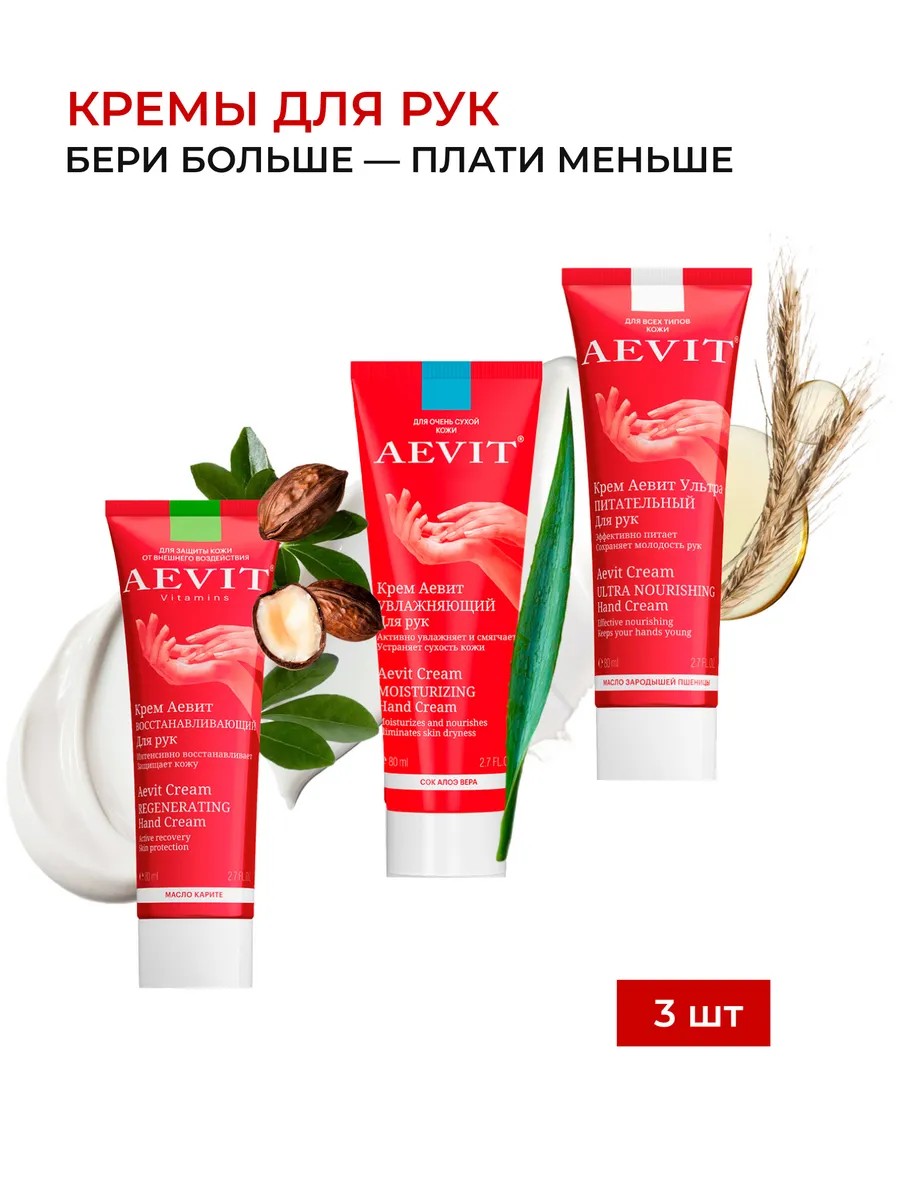| Комплектация | AEVIT крем для рук ультрапитательный 80 мл - 1шт; AEVIT крем для рук увлажняющий 80 мл - 1шт; AEVIT крем для рук восстанавливающий 80 мл - 1шт |