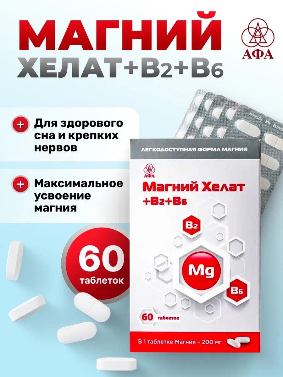 Афа Магний Хелат + В2 + В6, 200 мг. 60 таблеток