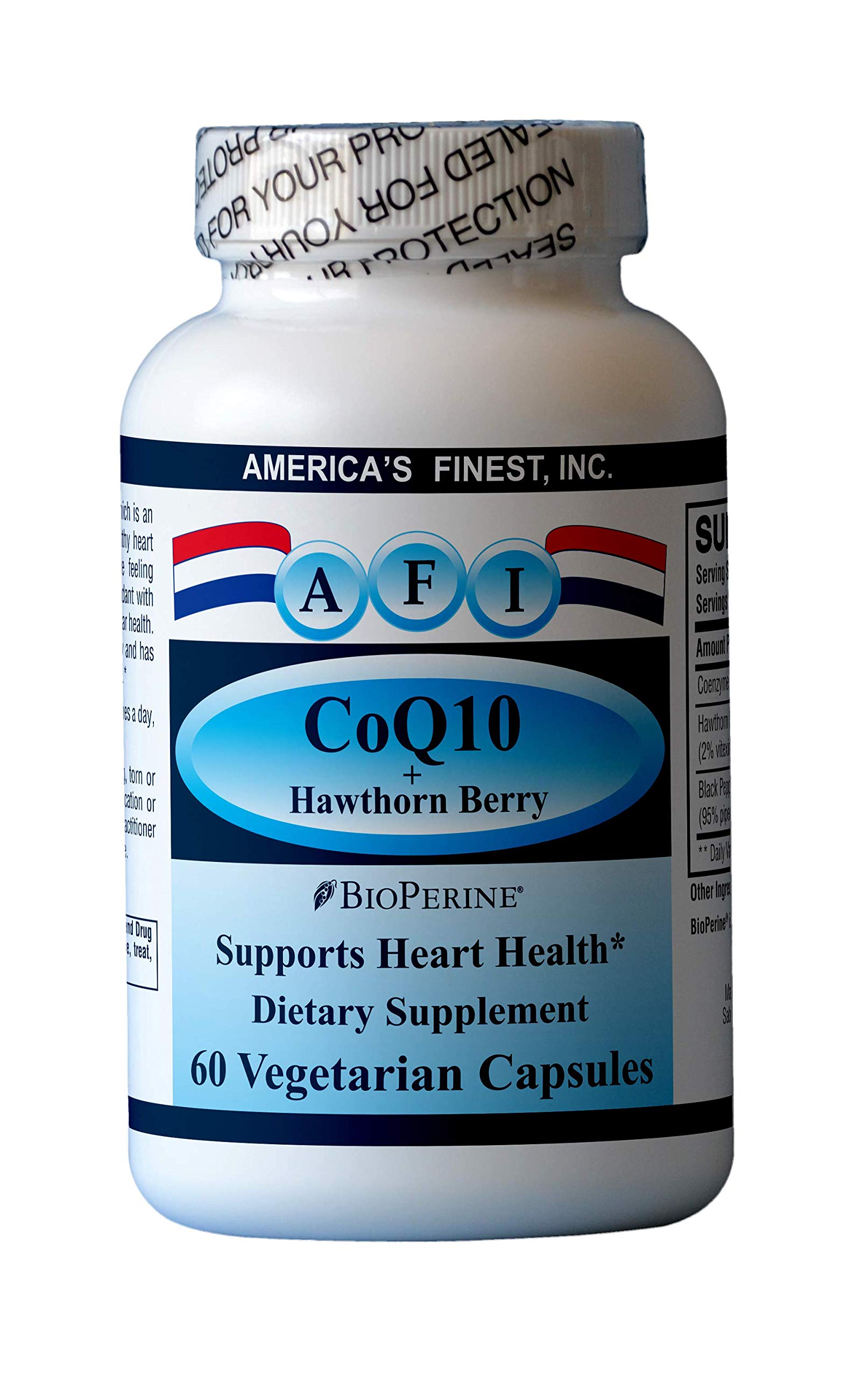 America's Finest, Inc's CoQ10 provides highly bioavailable Ubiquinone, an essential nutrient for all ages, supporting a healthy heart function and providing cellular energy levels for those feeling occasional fatigue. Hawthorne Berry is a powerful antioxidant with free radical scavenging activity and promotes cardiovascular health. BioPerine helps enhance this formula's bioavailability and has been clinically studied for increg absorption of CoQ10.