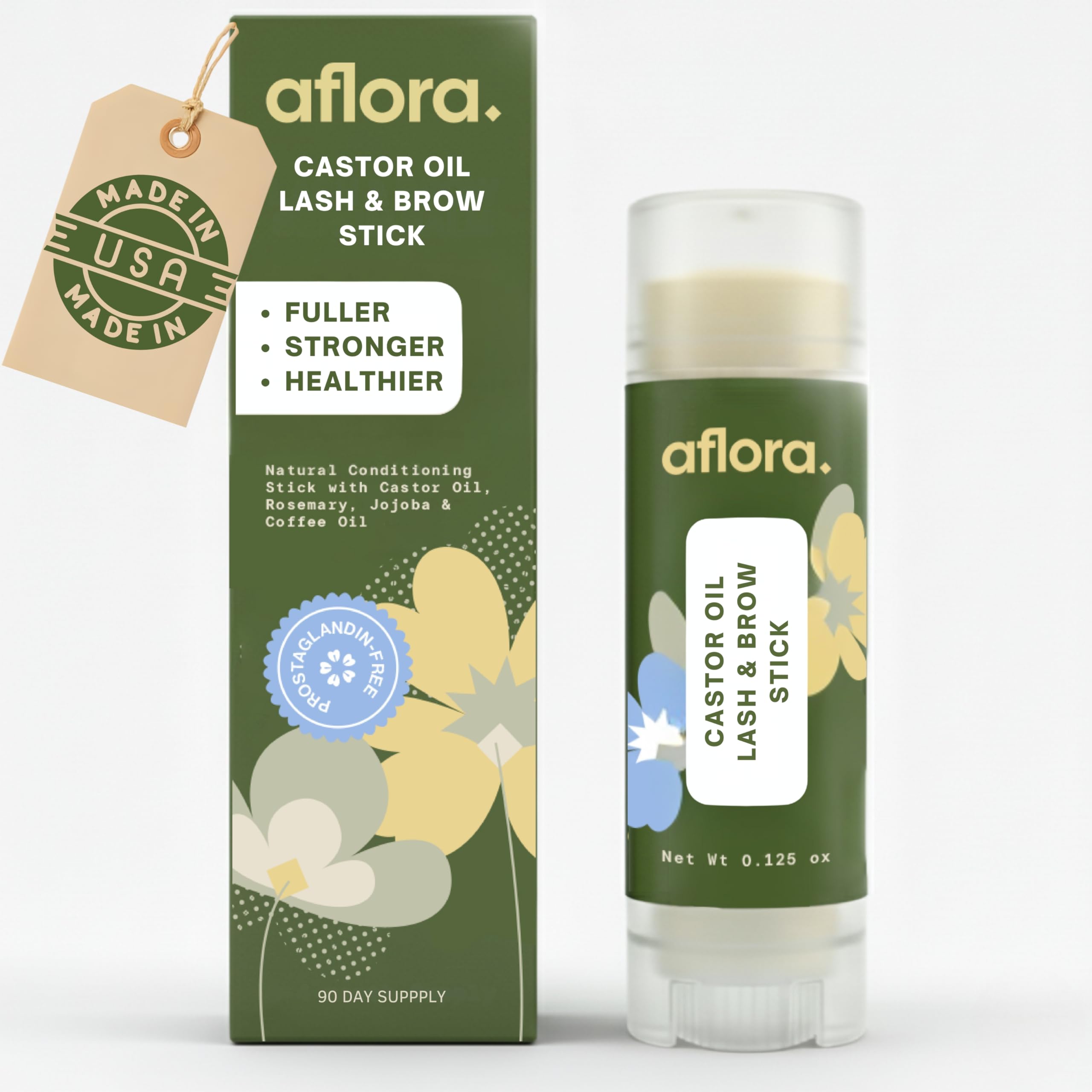 Aflora Castor Oil Lash & Brow Stick Solid Brow & Eyelash Serum Balm No Drip 100% Natural and Clean Formula Prostaglandin Free Made in USA