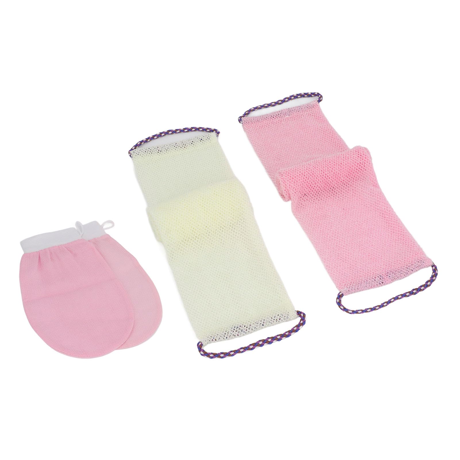 PACKAGE INCLUDES: The set includes 2 bath sponges and 2 bath gloves, allowing for easy replacement or sharing among family members. EFFECTIVE CLEANSING: With multiple net holes, the bath sponge effectively removes dirt, dust, and dead skin from your body, providing a deep exfoliating experience. NYLON MATERIAL: Made from gentle and skin friendly nylon, the net bath sponge is designed to be safe for delicate skin. It is stable, reliable, and easy to . QUICK DRYING: Hanging the net bath sponge in a well ventilated area after use, and it will dry quickly. We recommend replacing it every 2 to 3 months for optimal hygiene. CONVENIENT HAND STRAPS: The net bath sponge is equipped with 2 hand straps for easy gripping. After use, it can be hung on the wall, saving space and ensuring it stays dry and hygienic.