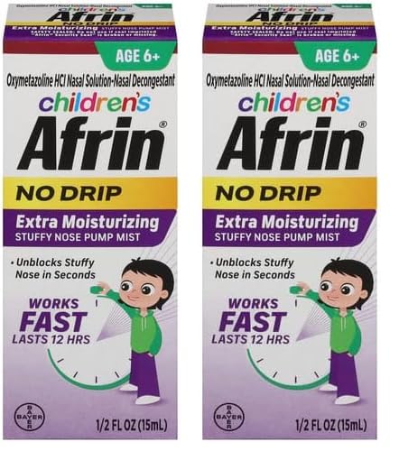 Afrin No Drip Extra Moisturizing Stuffy Nose Spray for children ages 6 over provides Nasal Congestion Relief in Seconds from colds and allergies and lasts 12 hours, so your child can breathe more freely all-day and all-night. Temporarily relieves nasal congestion due to: common cold, hay fever, upper respiratory allergies.