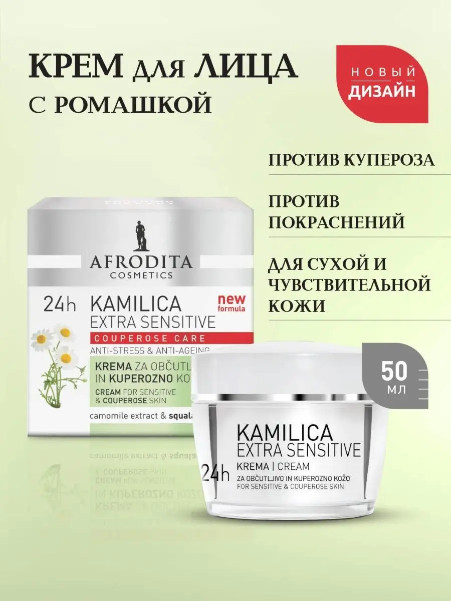 Крем для чувствительной кожи лица от купероза AFRODITA COSMETICS предназначен для ухода сухой и нормальной кожей. Уменьшает сосудистые звездочки, улучшает структуру и эластичность кожи, устраняет неприятное чувство стянутости, успокаивает и снимает покраснения. Этот уникальный крем сочетает в себе питательные и увлажняющие свойства, которые помогают уменьшить раздражение и восстановить естественный барьер защиты дермы. Состав крема включает в себя сквалан, экстракт цветков ромашки аптечной, экстракт семян конского каштана, центеллу, экстракт корня иглицы колючей, экстракт цветков календулы, экстракт листьев розмарина, молочную кислоту, масло ши. Эти компоненты обеспечивают глубокое увлажнение и питание кожи, делая её более упругой и здоровой. Средство защищает от преждевременного старения, подходит для дневного и ночного использования, обеспечивая круглосуточную заботу о вашей коже.