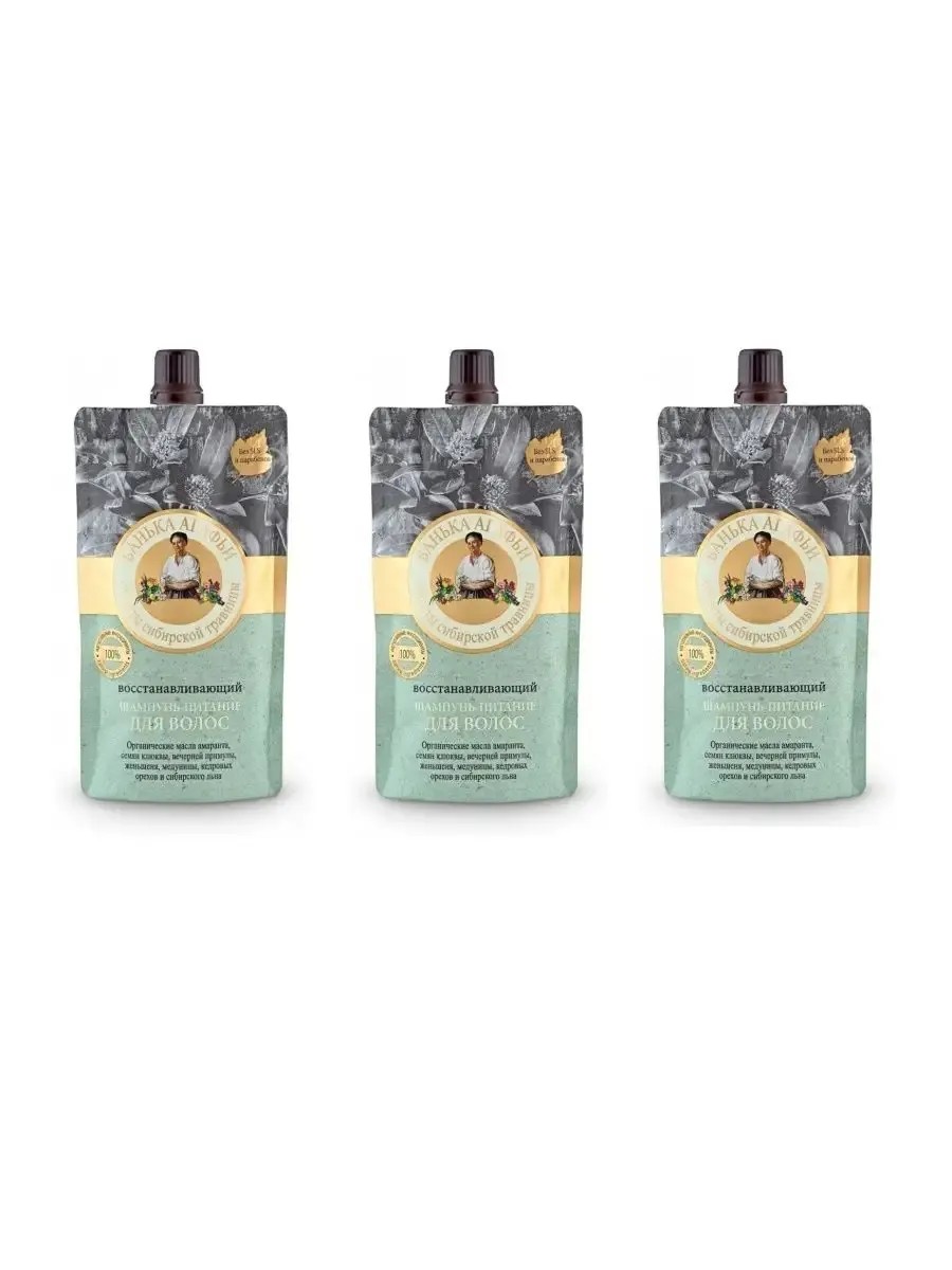 Банька Агафьи ДОЙ-ПАК Шампунь питание Восстанавливающий, 100мл, 3 шт. Шампунь-питание на органических маслах, богатых микроэлементами и витаминами, идеально подходит для интенсивного восстановления сухих и ослабленных волос. Увлажняет и возвращает волосам природную силу, здоровый блеск и эластичность. Масло амаранта содержит сквален, способствует насыщению клеток кислородом, масло семян клюквы увлажняет волосы. Масла примулы вечерней и женьшеня богаты микроэлементами и органическими кислотами, питают кожу головы. Масло медуницы содержит флавоноиды, аллантоин и минеральные вещества, способствует росту волос. Масло кедровых орехов предотвращает ломкость и выпадение волос. Масло сибирского льна богато витаминами Е и А, жирными кислотами Омега-3, интенсивно питает и восстанавливает поврежденную структуру волос.