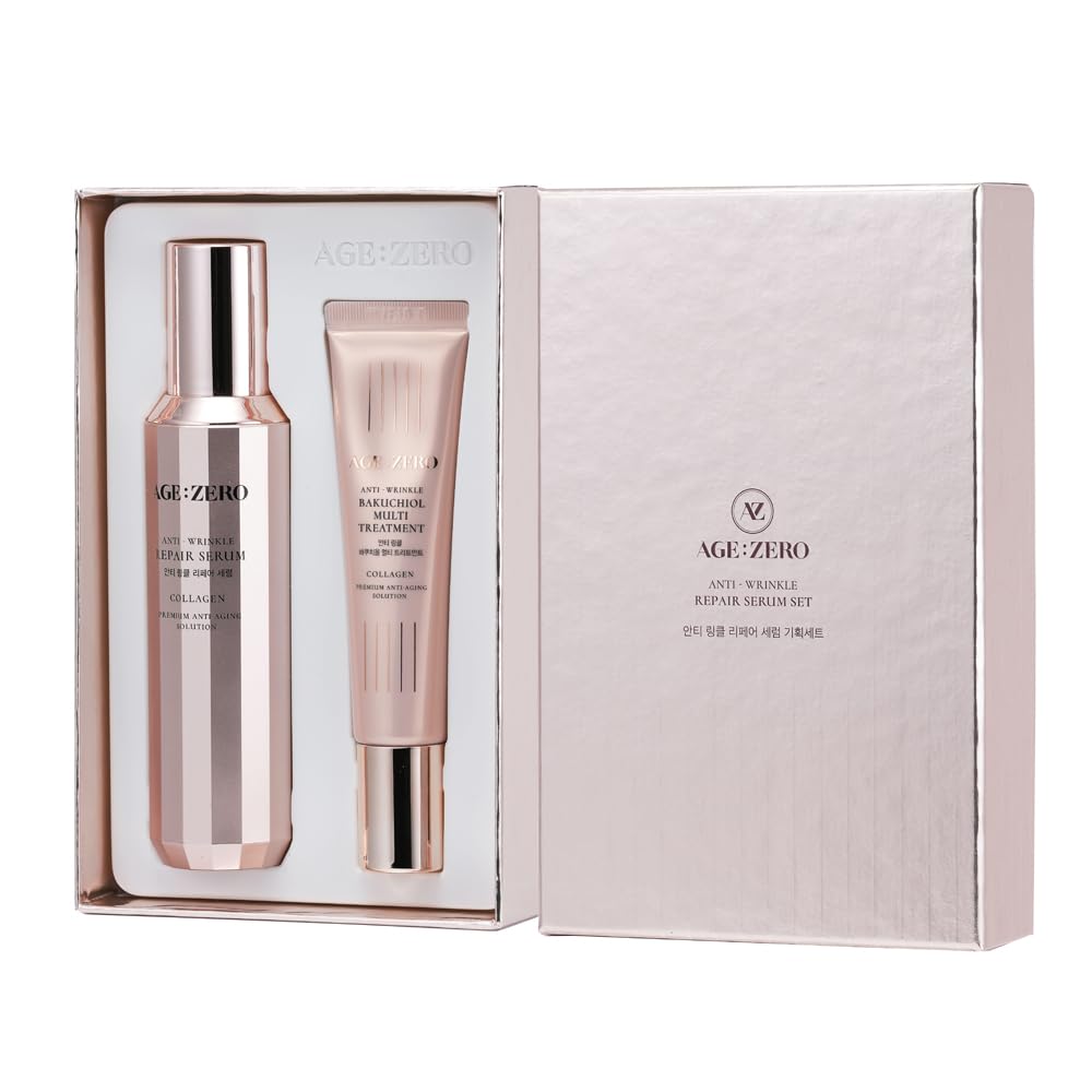 AGE:ZERO Anti Wrinkle Repair Serum Treatment Kit Revitalize and transform your skin with the AGE:ZERO Anti Wrinkle Repair Serum Treatment Kit, a vegan K-Beauty solution designed for anti-aging, hydration, and radiance. This complete kit includes a 50ml serum formulated with retinol, niacinamide, and hydrolyzed collagen to deeply hydrate, improve skin elasticity, and support brightening, and a 25ml treatment enriched with bakuchiol, serving as a multi-spot and eye cream for targeted firming, wrinkle improvement, and radiance enhancement. Both formulas are lightweight, non-sticky, and absorb quickly for a comfortable daily skincare routine. Ideal for dry and dull skin, the serum and treatment work together to strengthen the skin barrier while delivering a soothing TW-Moist Calm Complex. Apply daily on your face, neck, and delicate areas for hydration, elasticity, and wrinkle care. Dermatologically tested for safe and gentle care, these high-concentration formulas allow you to enjoy the benefits of Korean skincare science in a luxurious and effective routine. The AGE:ZERO Anti Wrinkle Repair Kit is perfect for those seeking a complete facial treatment in one kit. Experience the glow, firmness, and radiance that comes from consistent use of vegan, high-performance skincare with a subtle Elclat scent. Make it a part of your everyday regimen to nourish, protect, and rejuvenate your skin, revealing a youthful, luminous complexion.Vegan K-Beauty Skincare – Dermatologically tested, vegan-friendly, and formulated with high-concentration ingredients for safe and gentle care. Radiance-Enhancing – Daily use improves skin glow and illumination, helping dull skin look luminous and revitalized. Firming Elasticity – Supports skin barrier and improves elasticity, firmness, and wrinkle appearance for a youthful, lifted look. Hydrating Lightweight – Non-sticky, quick-absorbing formulas that deeply hydrate dry and dull skin for a comfortable daily routine. Complete Anti-Aging Kit – Includes 50ml serum with niacinamide and hydrolyzed collagen and 25ml treatment with bakuchiol, serving as a multi-spot eye cream.