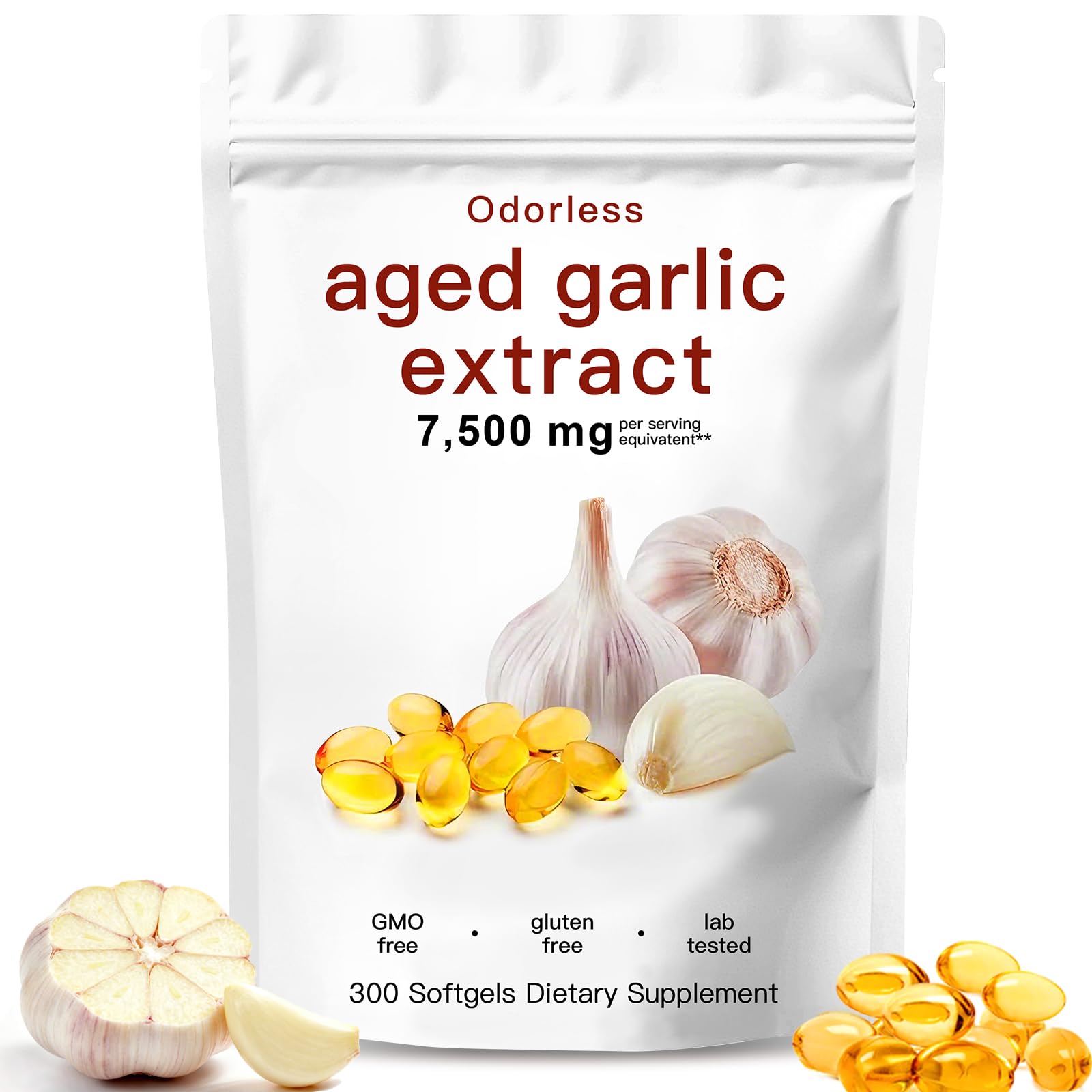Aged Garlic Extract-300 Count 7500mg Odorless Organic Garlic Capsules Supplement for Heart & Immune Support Vegetarian Non-GMO All-Natural Softgels 2-Year Matured for Antioxidant Wellness