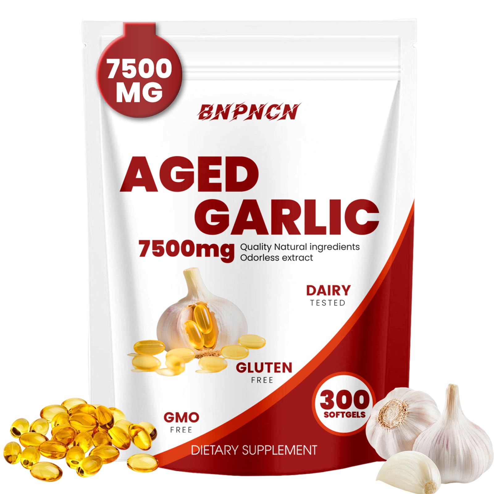 Note: 1. Under existing technical conditions, the garlic smell cannot be completely removed and you will smell some odor when you open the package.However, we use advanced encapsulation technology to remove most of the taste while effectively retaining its effectiveness without sacrificing efficacy. 2. In warm weather, the softgels may clump and clump. This is normal and does not affect the quality or efficacy of the product. To remove clumps, shake or tap the package vigorously. SUPPORTS VITAL HEALTH:Strengthens natural immune defenses, and provides rich antioxidant protection year-round. 100 ODORLESS GENTLE: no garlic breath or stomach upset. Gluten-free, non-GMO, and free from soy, dairy, tree nuts. Each serving delivers a high-strength dose of aged garlic extract (360mg per 2 softgels, equivalent to 7,500mg fresh garlic), organically sourced and aged for 20-24 months to preserve natural antioxidants. MAXIMUM POTENCY 7,500MG 15:1 extract Specialized cold processing method preserves the natural goodness of garlic while reducing the odor.