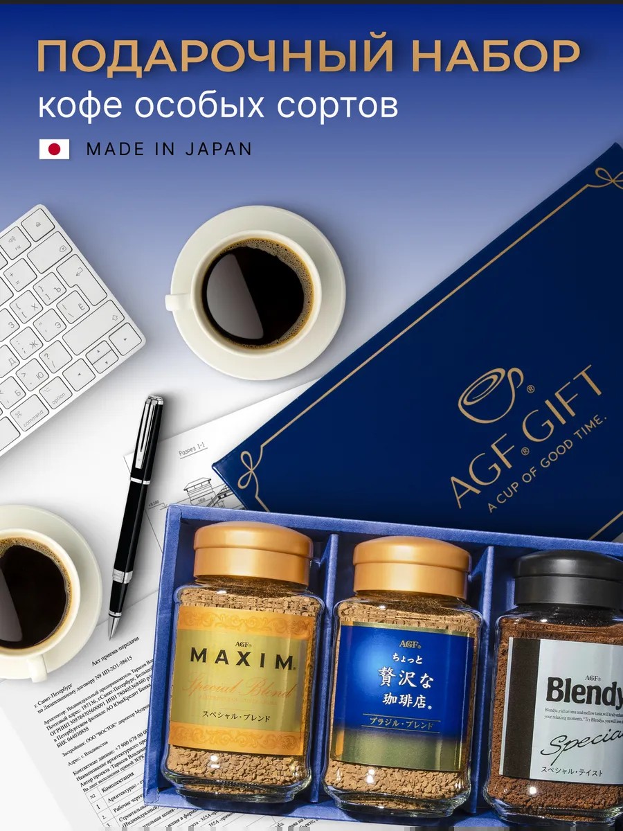 Подарочный набор из трёх банок (200 г) японского растворимого кофе AGF – идеальный выбор для любителей качественного кофе.