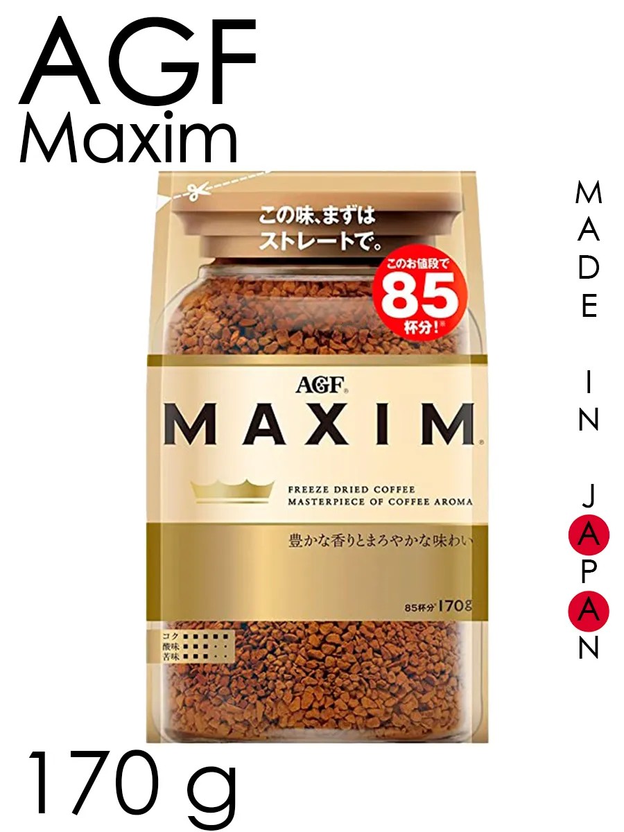 MAXIM - это настоящий, аутентичный растворимый кофе из Японии, созданный легендарным брендом японских мастеров AGF. Уникальная смесь отборных кофейных зерен нескольких сортов тщательно обжаривается на раскаленных углях, чтобы придать напитку насыщенный аромат и элегантный волнующий вкус. MAXIM состоит на 100% из Арабики, выращенной на кофейных плантациях в Колумбии и Бразилии. Этот кофе сублимирован, что означает, что он был подвергнут процессу замораживания и сушки для сохранения свежести и вкуса. MAXIM - это прекрасный выбор для тех, кто ценит настоящий, высококачественный кофе.