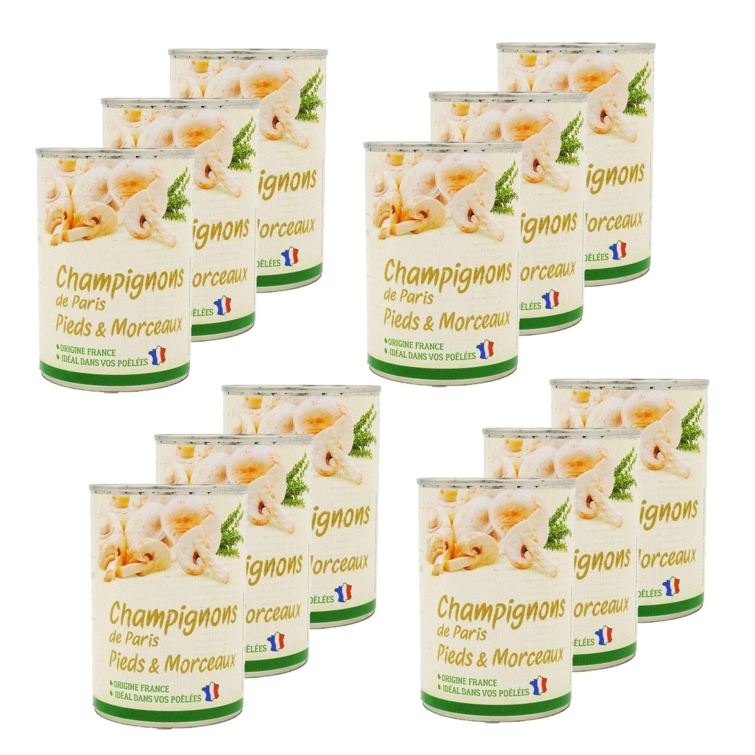 This pack contains 12 products described below: These practical, first-choice button mushrooms (stems and pieces) are a must-have in your cupboards. Ingredients: Button mushrooms (Agaricus bisporus), water, salt, acidifier: citric acid, antioxidant: ascorbic acid. Allergens: None. Storage instructions: Store at room temperature, away from heat and humidity, before opening. Directions for use: Drain and rinse before using in your dishes. Product information: Net weight: 390g. Origin: France. Energy: 76kJ 18kcal. Fat: 0.5g, of which saturates 0.1g. Carbohydrate: 0.9g, of which sugars 0.5g. Protein: 1.7g. Dietary fiber: Not specified. Salt: 0.61g. Packaging: Metal tin. Full details are available on the product packaging. The information on this page is for guidance only. We encourage you to read the information on the product label, especially regarding food allergies. SAFETY WARNING Full details are available on the product packaging. The information on this page is for guidance only. We encourage you to read the information on the product label, especially regarding food allergies.Agidra Lot 12x Champignon Paris pieds et morceaux - France - Boîte 390gDESCRIPTION DU PRODUIT DESCRIPTION DU PRODUIT Ce lot contient 12 produits décrits ci-dessous :Pratique, ces champignons de Paris pieds et morceaux sélection 1er choix sont incontournable dans vos placards.'Ingrédients : Champignons de Paris (Agaricus bisporus), eau, sel, acidifiant : acide citrique, antioxydant : acide ascorbique. Allergènes : AucunMode de conservation : A conserver à température ambiante, à l'abri de la chaleur et de l'humidité avant ouverture.Conseil d'utilisation : Egoutter et rincer avant l'utilisation dans vos plats.Informations produit : Poids net : 390gOrigine : FranceEnergie : 76KJ 18Kcal Lipides : 0,5g dont acides gras saturés 0,1gGlucides : 0,9g dont sucres 0,5gProtéines : 1,7gFibres alimentaires : NCgSel : 0,61gEmballage : Boîte en MétalDétail complet et disponible sur l'emballage du produit. Les informations présentes sur cette page sont à titre indicatif. Nous vous invitons à prendre connaissance des informations sur l'étiquette du produit, en particulier concernant les allergies alimentaires. AVERTISSEMENT DE SÉCURITÉ Détail complet et disponible sur l'emballage du produit. Les informations présentes sur cette page sont à titre indicatif. Nous vous invitons à prendre connaissance des informations sur l'étiquette du produit, en particulier concernant les allergies alimentaires.