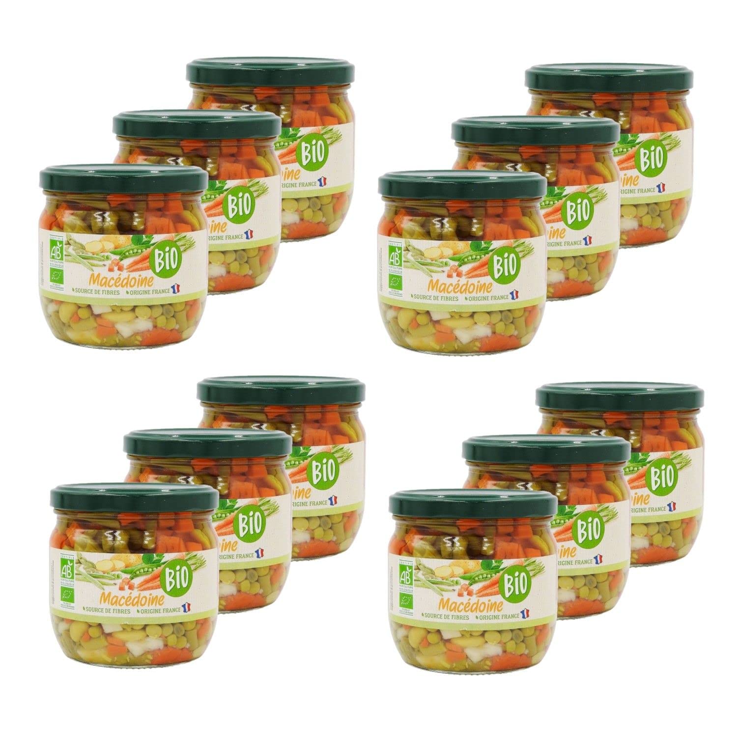 This pack contains 12 products as described below: Organic Mixed Vegetables is a flavorful and colorful blend of carefully selected organic vegetables. Ready to use, this mixed vegetable mix is ideal for quickly preparing fresh salads, side dishes, or Mediterranean-inspired meals. With its guaranteed organic quality, this mixed vegetable mix offers a healthy and delicious option for your everyday meals. Ingredients: Water, carrot , potato , green bean , pea , flageolet bean , sea salt. Ingredient from organic farming. Allergens: Storage Instructions: Store at room temperature, away from heat and humidity, before opening. Serving suggestion: Add it to salads for freshness and texture, or use it as a base for stir-fried vegetables or vegetable dishes. It can also be used as an ingredient in soups or sauces to add flavor and vegetables to your recipes. Product information: Net weight: 330g Origin: France Energy: 229kJ 54kcal Fat: 0.5g of which saturates 0g Carbohydrate: 8.6g of which sugars 1.8g Protein: 2.4g Dietary fiber: 3.8g Salt: 0.46g Packaging: Glass jar Full details are available on the product packaging. The information on this page is for guidance only. We encourage you to read the product label, especially regarding food allergies. INGREDIENTS Water, carrot , potato , green bean , pea , flageolet bean , sea salt. Ingredient from organic farming. SAFETY WARNING Full details are available on the product packaging. The information on this page is for guidance only. We encourage you to read the product label, especially regarding food allergies. See moreLot 12x Macédoine de légumes BIO - Bocal 330g 1 Unité (Lot de 12)DESCRIPTION DU PRODUIT DESCRIPTION DU PRODUIT Ce lot contient 12 produits décrits ci-dessous : La macédoine de légumes BIO est un mélange savoureux et coloré de légumes biologiques soigneusement sélectionnés. Prête à l'emploi, cette macédoine de légumes est idéale pour préparer rapidement des salades fraîches, des accompagnements ou des plats d'inspiration méditerranéenne. Avec sa qualité biologique garantie, cette macédoine de légumes vous offre une option saine et délicieuse pour vos repas quotidiens. Ingrédients : Eau, carotte , pomme de terre , haricot vert , petit pois , flageolet , sel de mer. Ingrédient issu de l'agriculture biologique. Allergènes : Mode de conservation : A conserver à température ambiante, à l'abri de la chaleur et de l'humidité avant ouverture. Conseil d'utilisation : Vous pouvez l'ajouter à des salades pour apporter de la fraîcheur et de la texture, ou l'utiliser comme base pour des plats de légumes sautés ou des poêlées. Elle peut également être utilisée comme ingrédient dans des soupes ou des sauces pour ajouter de la saveur et des légumes à vos préparations. Informations produit : Poids net : 330g Origine : France Energie : 229KJ 54Kcal Lipides : 0,5g dont acides gras saturés 0g Glucides : 8,6g dont sucres 1,8g Protéines : 2,4g Fibres alimentaires : 3,8g Sel : 0,46g Emballage : Bocal en Verre Détail complet et disponible sur l'emballage du produit. Les informations présentes sur cette page sont à titre indicatif. Nous vous invitons à prendre connaissance des informations sur l'étiquette du produit, en particulier concernant les allergies alimentaires. INGRÉDIENTS Eau, carotte , pomme de terre , haricot vert , petit pois , flageolet , sel de mer. Ingrédient issu de l'agriculture biologique. AVERTISSEMENT DE SÉCURITÉ Détail complet et disponible sur l'emballage du produit. Les informations présentes sur cette page sont à titre indicatif. Nous vous invitons à prendre connaissance des informations sur l'étiquette du produit, en particulier concernant les allergies alimentaires. Voir plus