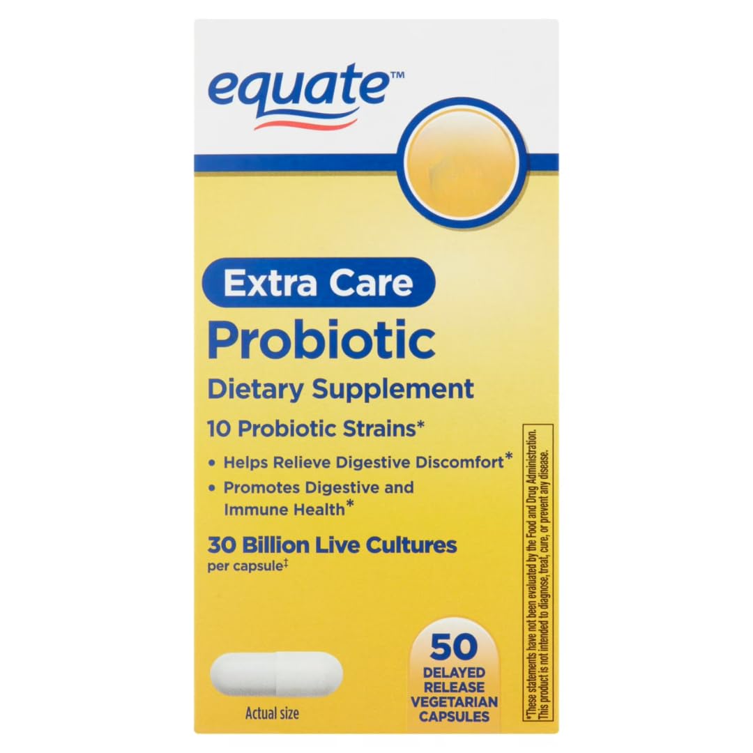 Equate Extra Care Probiotic Delayed-Release Capsules 30 Billion CFU 10 Strains, 50 Count AGILIPET Sticker