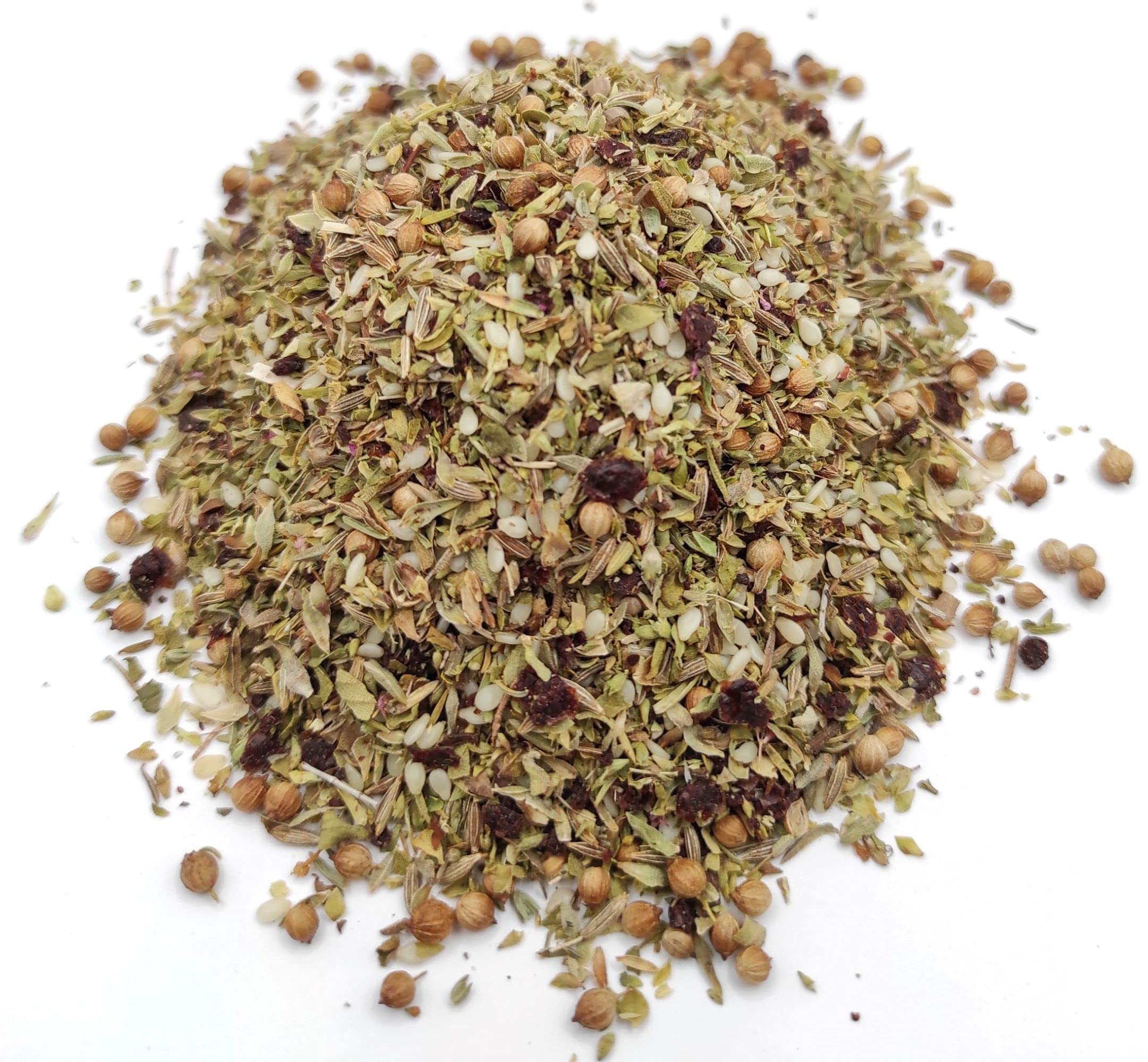 Sumac gives it the wonderful unexpected sharpness that is the key to the best Zaatar. As an indication, 20-30 grams of kosher salt can be added to 100 grams of our za'atar mix. Our za'atar Blend can be sprinkled over hummus, labneh, roasted vegetables, eggs, salads, meat, fish or over fresh pita bread drizzled with extra virgin olive oil (preferably Greek) before going into the oven to toast. Instructions: Add it to your dishes as it is or put the Za'atar mix in a blender or a grater until it becomes powder. Store in a cool, dry place away from sunlight. INGREDIENTS Wild Greek mountain oregano, wild Greek thyme, sesame seeds, coriander, cumin, sumacZa'atar Special Kruidenmix 85g - 1.95Kg Zatar Zaatar (460 gram) Sumac geeft het de heerlijke onverwachte scherpte die de sleutel is tot de beste Zaatar. Ter indicatie, in 100 gram van onze za'atar mix kan 20-30 gram koosjer zout worden toegevoegd. Onze za'atar Blend kan worden gestrooid over hummus, labneh, geroosterde groenten, eieren, salades, vlees, vis of over vers pitabroodje besprenkeld met extra vergine olijfolie (bij voorkeur Grieks) voordat het in de oven gaat om te roosteren. Instructies: Voeg het toe aan je gerechten zoals het is of doe de Za'atar-mix in een blender of een rasp tot het poeder wordt. Bewaren op een koele, droge plaats uit de buurt van zonlicht. INGREDIËNTEN Wilde Griekse bergoregano, wilde Griekse tijm, sesamzaad, koriander, komijn, sumak