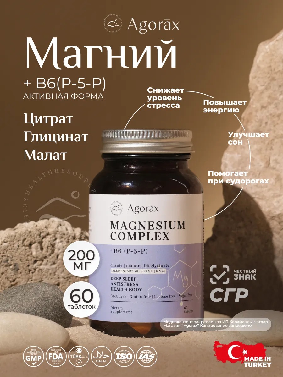 Магний ЦИТРАТ + Магний ГЛИЦИНАТ + Магний МАЛАТ + Витамин В6 — это биологически активная добавка, которая поможет вам поддержать здоровье и самочувствие. В составе Магний в6 для женщин и мужчин — высокоусвояемые формы магния, цитрат, малат и глицинат, которые способствуют нормализации работы нервной системы, улучшению сна и снижению усталости. Витамин В6 в составе комплекса участвует в обмене веществ и способствует поддержанию нормального уровня глюкозы в крови. Регулярный прием добавки от AGORAX поможет вам чувствовать себя бодрее, энергичнее и более устойчивым к стрессу.