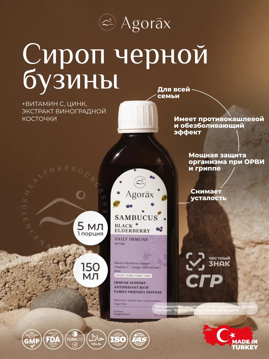 Натуральный сироп бузины черной от AGORAX обладает приятным вкусом и легко принимается детьми.