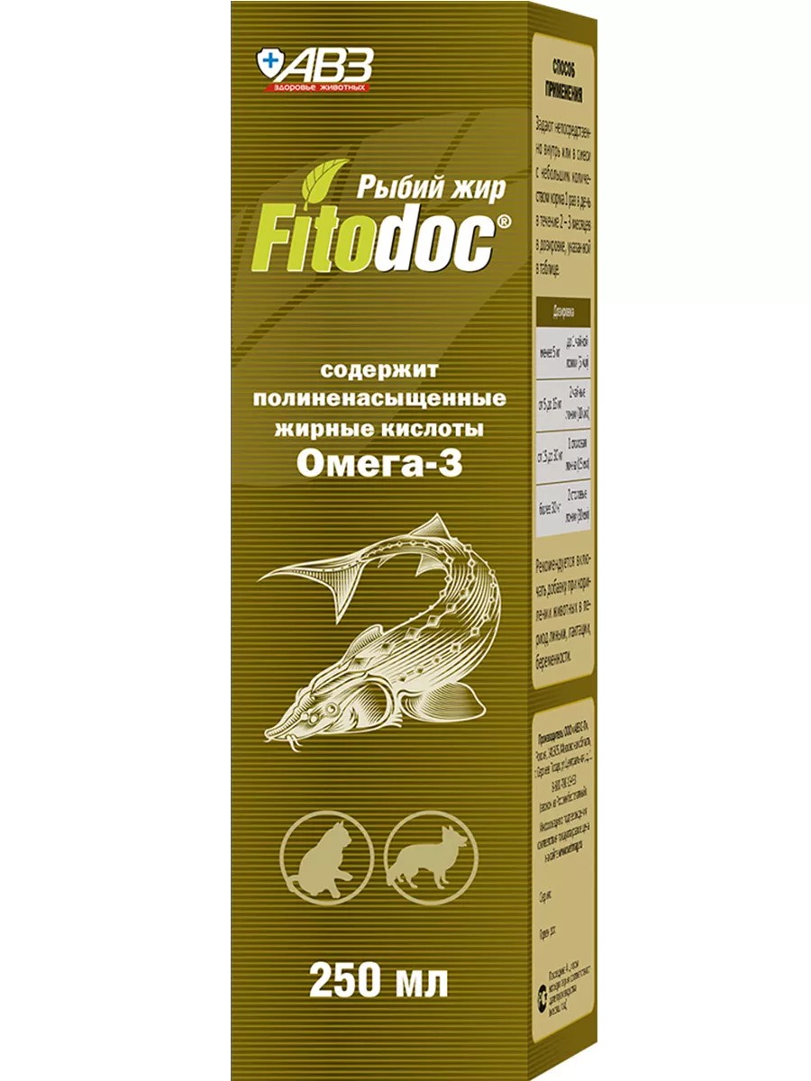 "Fitodok Fish Oil" is used to normalize metabolism in farm animals, including poultry, as well as fur animals, cats, and dogs.