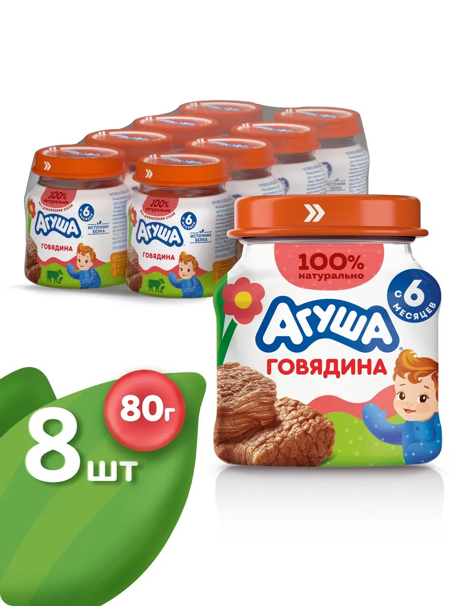 АГУША Детское пюре мясное Говядина 80г с 6 месяцев, 8 штук