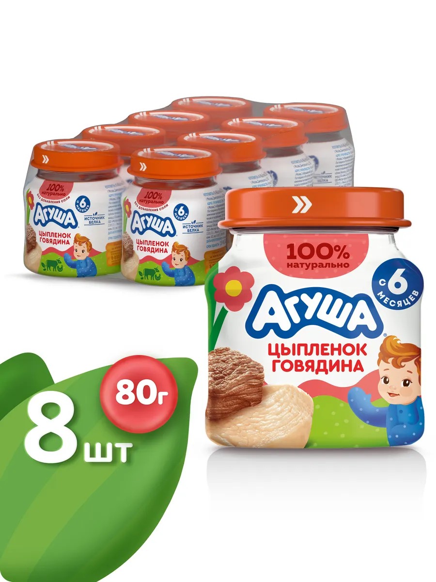 | Full name of product | Canned Agusha poultry "chicken and beef puree" homogenized. For baby food from 6 months, 8 pieces of 80 grams. |