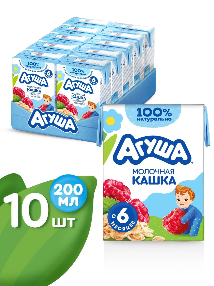 | Full name of product | Agusha liquid milk porridge Oatmeal "Vstavai-ka" with raspberry flavor. With a fat content of 2.5%. For children over 6 months. 10 pieces of 200 ml |