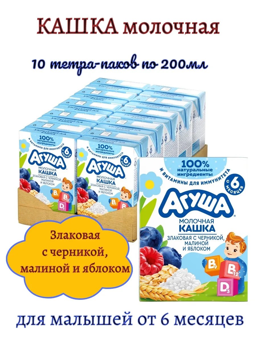 Agusha milk-cereal porridge with blueberry, raspberry, and apple, 2.7%, 200 ml. Recommended for children over 6 months. Made with natural standardized milk and cereals, berries, fruits, and other ingredients. Free from colorants, preservatives, and GMOs.