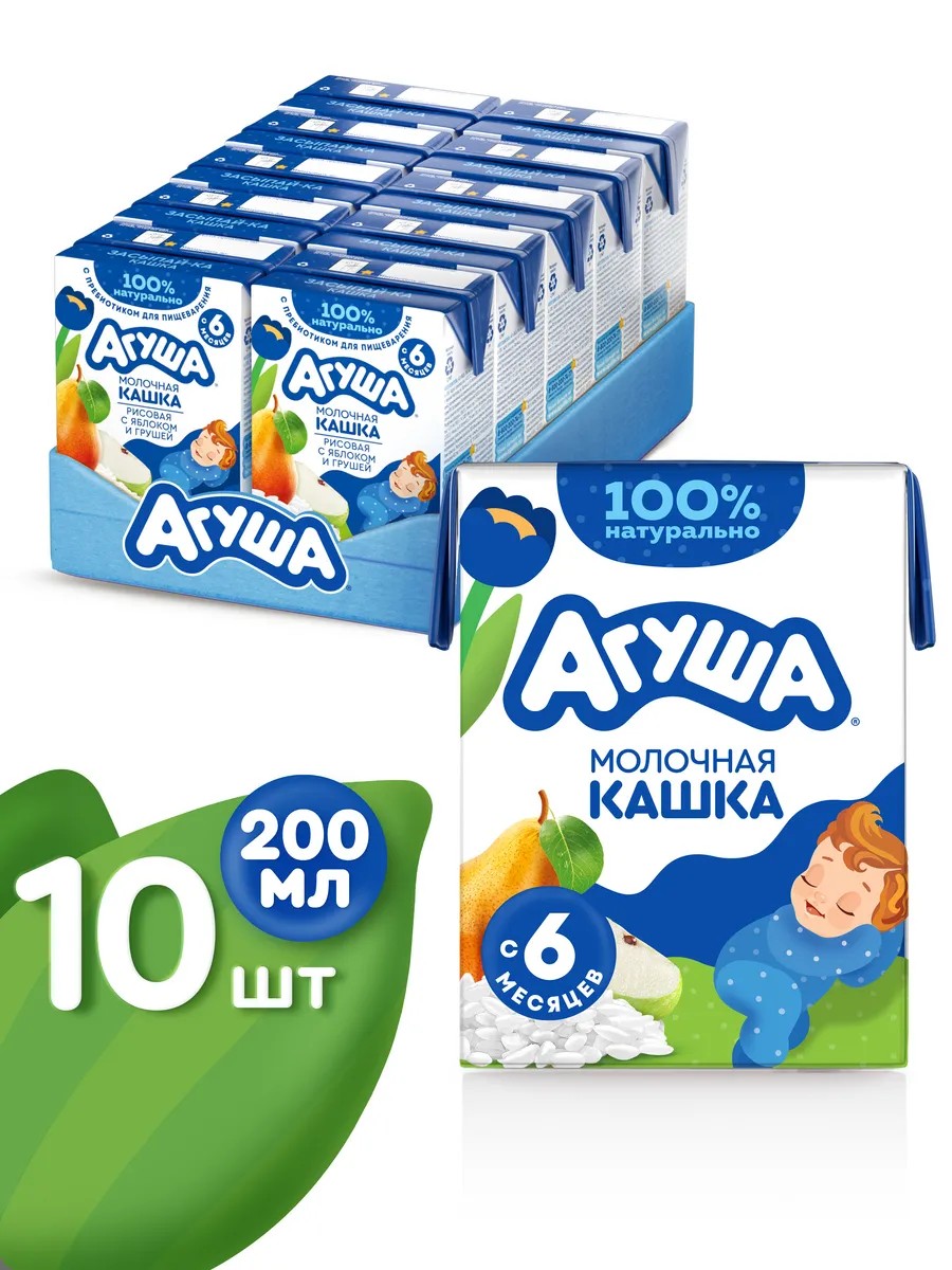 | Полное наименование товара | Каша Агуша жидкая молочная Рисовая "Засыпай-ка" со вкусом Яблоко-Груша. С массовой долей жира 2,7%. Для питания детей с 6 месяцев. 10 штук по 200 мл |