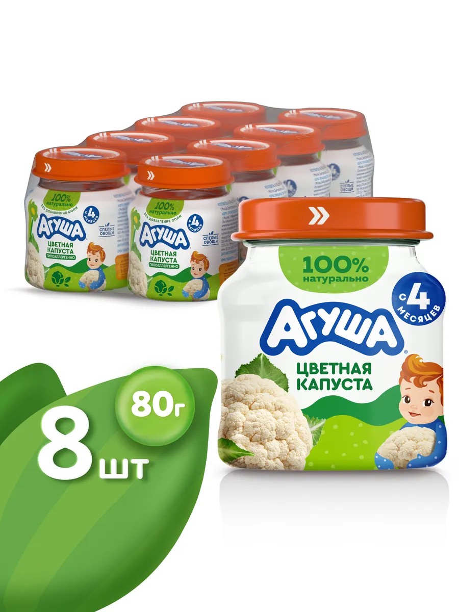 | Полное наименование товара | Овощное пюре Агуша из цветной капусты гомогенизированное. Для детского питания с 4 месяцев, 8 штук по 80 грамм |