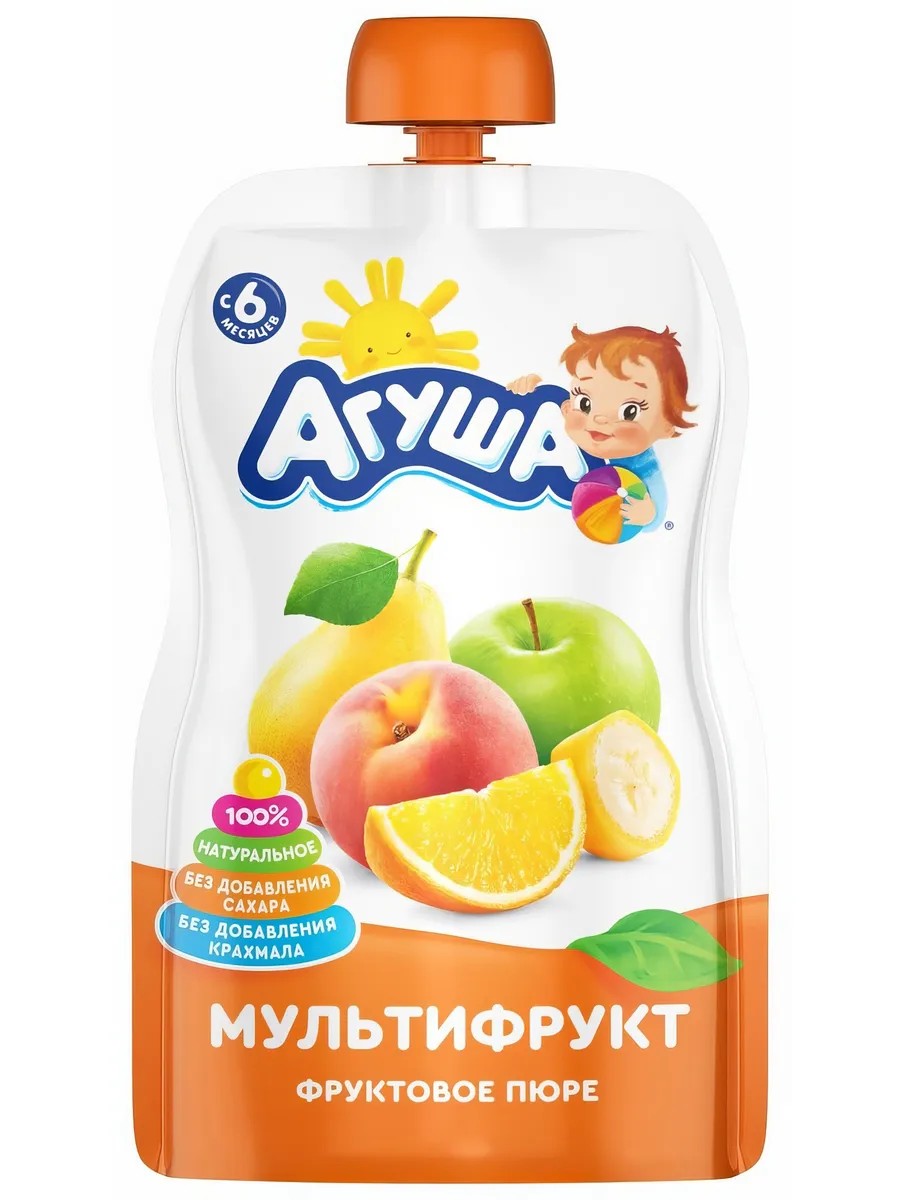 Agusha Multifruit Fruit Puree for ages 6+ months, 90g, is designed for babies 6 months and older. It's 100% natural: made with apples, peaches, pears, and bananas, with added orange and lemon juice, and contains no added sugar or starch. The homogenized puree has a rich, assorted fruit flavor. It's ready to eat. This delicious snack is convenient to take on a walk. The puree contains naturally occurring sugars.