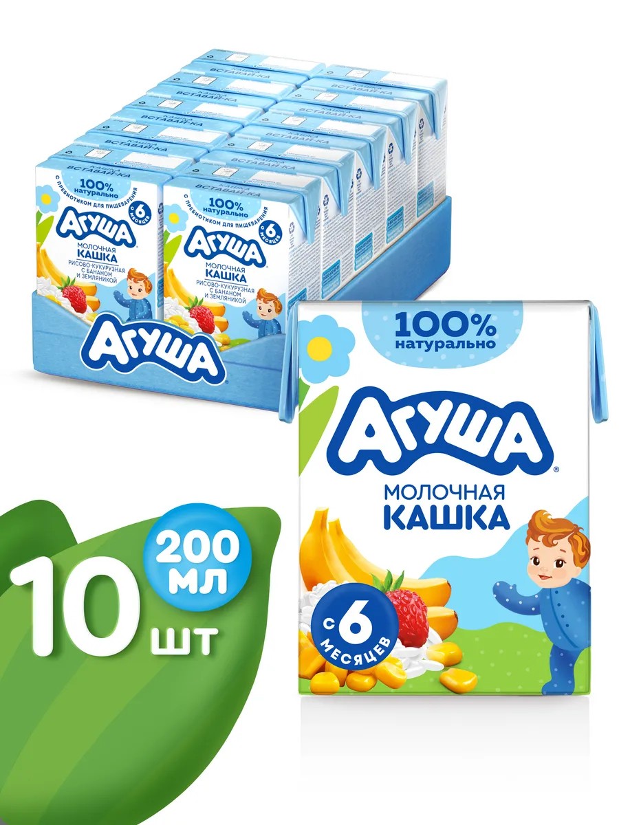 | Полное наименование товара | Каша Агуша жидкая молочная рисово-кукурузная с бананом и земляникой «Вставай-ка» стерилизованная, с пребиотическими пищевымиволокнами,с массовой долей жира 2,0 %. Для питания детей старше 6 месяцев. 10 штук по 200 мл |