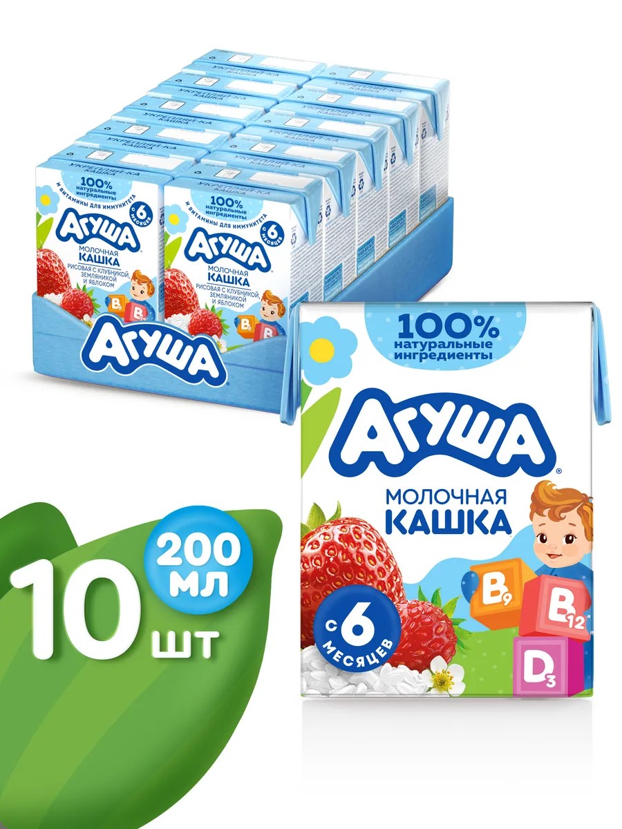 | Полное наименование товара | Каша Агуша жидкая молочная рисовая с клубникой,земляникой и яблоком "Укрепляй-ка", стерилизованная, обогащенная витаминами, с массовой долей жира 2,7%.для питания детей старше 6 мес. 10 штук по 200 мл |