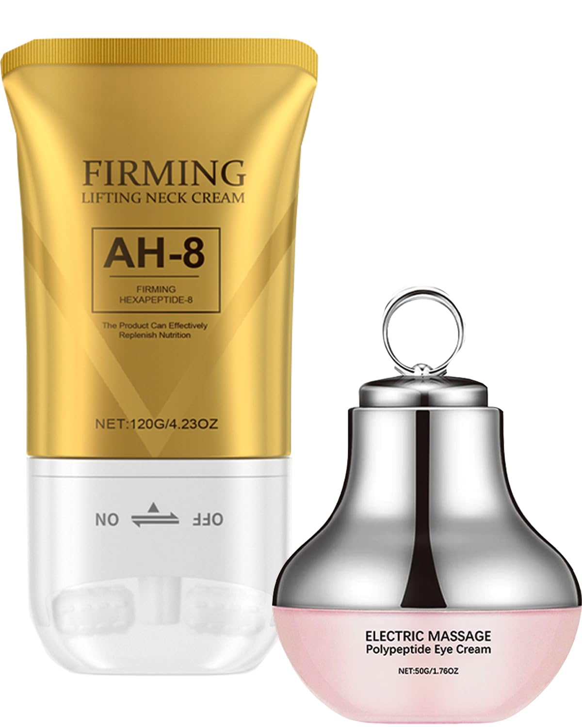 Thanksgiving and Christmas Gifts The AH-8 Neck Eye set is a perfect gift for your mom,wife,sister best friend or someone special.our Firming Neck Cream is also the holiday,Valentine's Day present,thankgiving days and Christmas,mothers day gifts .If you have any question for this facial wash brush please feel free to contact us.trust our facial cleansing brush silicone. Featherlight Texture: Instant Smoothness Both the neck cream and eye cream feature an air-whipped, ultra-light texture that melts into the skin upon contact. Feel an immediate improvement in smoothness and elasticity as they work to target neck sagging and crow's feet. ah8 firming neck and eye cream bundle Formulated to be gentle and effective, these creams are suitable for all skin types—including dry, oily, sensitive, and combination. They deliver long-lasting hydration without any greasy feel, leaving your skin silky-soft and supple all day.eye and neck firming cream. Electric Massage for Eyes: Fights Puffiness Dark Circles This eye cream features an electric massaging tip and a lightweight, fast-absorbing texture. The gentle vibrations help improve circulation, working to reduce under-eye bags, diminish dark circles and fine lines, and revitalize tired eyes. Dual-Ball Roller Massage: Deep Absorption, Non-Greasy The unique dual-ball roller glides seamlessly along the neck's contours. This motion boosts microcirculation, enhances deep absorption of the formula, and soothes puffiness. The hands-free application integrates a professional-grade lifting massage into your daily routine.ah 8 firming neck cream eye cream. AH-8 Neck Eye Care Set:Redefine Your Neck Contour Our core AH-8 firming complex, synergized with collagen, directly targets sagging skin and wrinkles. It effectively boosts skin elasticity to redefine your jawline and sculpt a firmer, more youthful-looking neck.AH-8 neck and eye cream bundle.