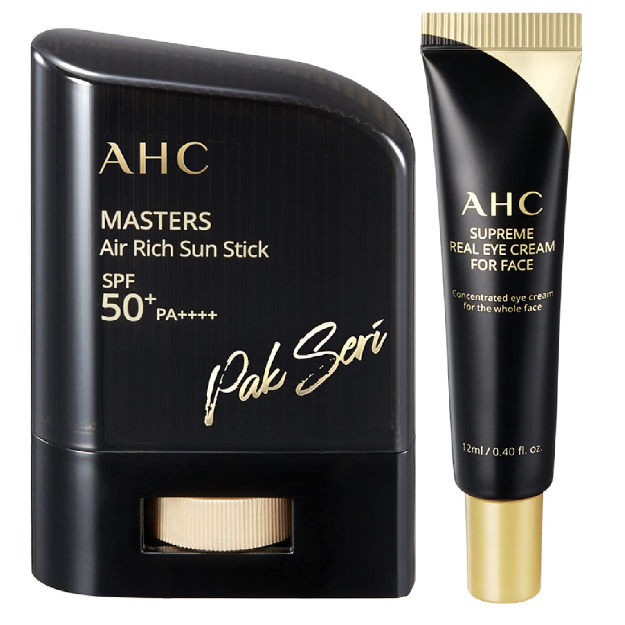 Age range description: Adult. AHC Masters Air Rich Sun Stick SPF50+PA++++ 14g / 0.49 oz. + AHC Supreme Real Eye Cream For Face 12ml / 0.40 fl.oz. AHC Eye Cream: Anti-aging, Wrinkle Care with rich nutrition. Concentrated eye cream for whole face. Sebum control, soft finish with a light-adhesive air texture. Sun stick with light application, soft finish, and 24-hour moisturizing effect. AHC Sun Stick: Strong sunlight protection effect lasts even during long outdoor activities. (Long lasting & Waterproof), Collaboration with Pak Seri (South Korean professional golfer).