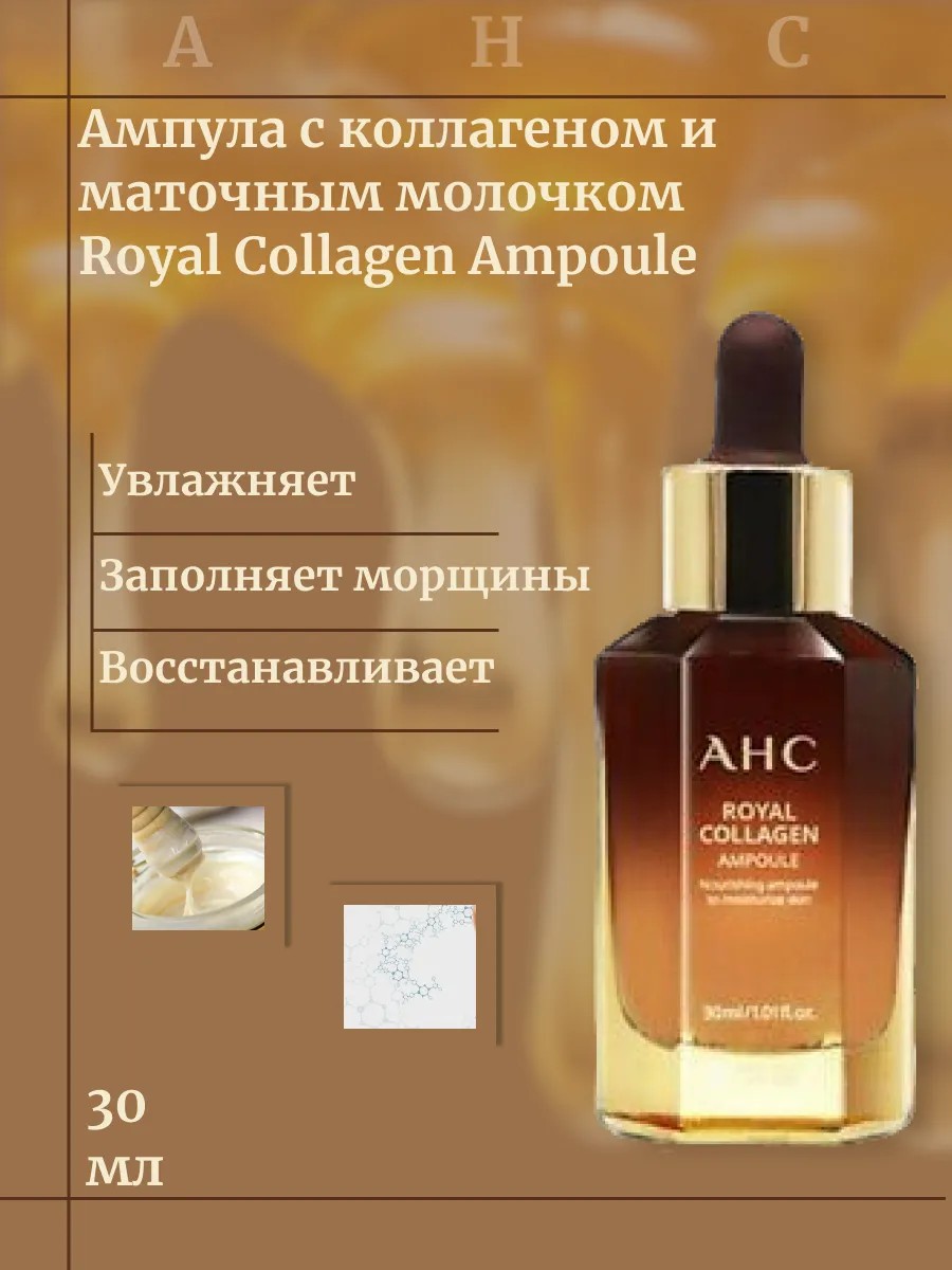 Anti-aging facial ampoule with collagen and royal jelly, AHC Royal Collagen Ampoule, restores skin elasticity and firmness, strengthens the dermis, and combats age-related changes.
