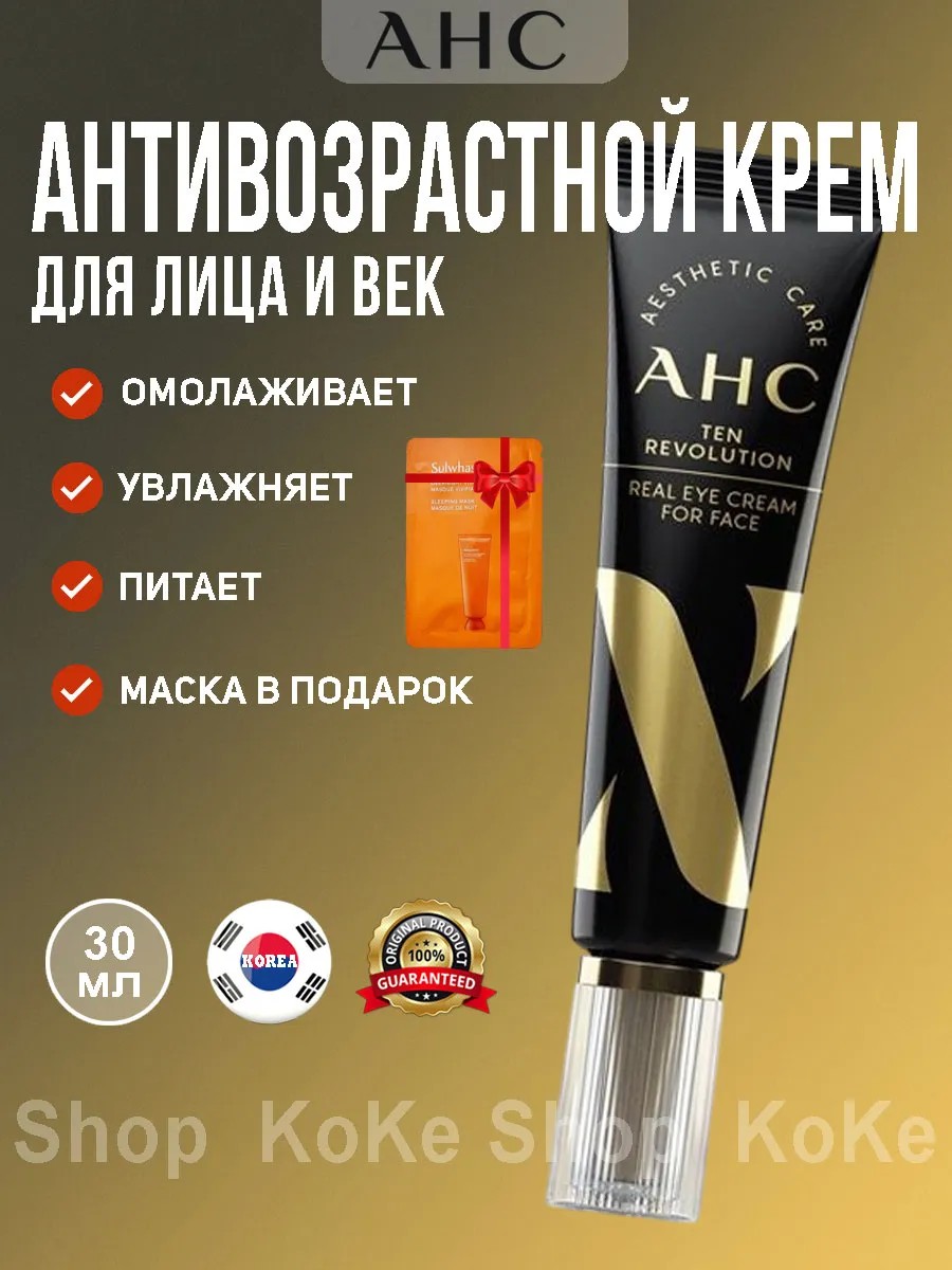 Дневной / ночной омолаживающий крем для век против морщин AHC Ten Revolution Real Eye Cream для нежной чувствительной кожи в области вокруг глаз - профессиональная усовершенствованная уходовая косметика premium care от корейского бренда AHC. Натуральный обновленный состав: 34 вида пептидов; 11 видов гиалуроновой кислоты; коллаген collagen; ретинол retinol; стволовые клетки; 16 витаминов; экстракт масла ши, зеленого чая, алое, авокадо. Какой косметический эффект имеет крем для зоны вокруг глаз? Увлажняющий - повышает способность клеток удерживать влагу. Регенерирующий, восстанавливающий упругость, замедление старения. Укрепляющий, успокаивающий - восстанавливает клетки изнутри. Корректирующий - осветляющий, отбеливающий. Подтягивающий, разглаживающий морщины по контуру глаз, убирает отеки и следы усталости.