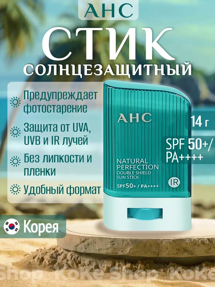 Стойкий и легкий универсальный солнцезащитный стик AHC Natural Perfection Double Shield Sun Stick SPF 50+ PA++++ / СПФ 50 обладает высокой степенью защиты от солнечных лучей, предупреждает появление нежелательной пигментации и поддерживает молодость кожи.