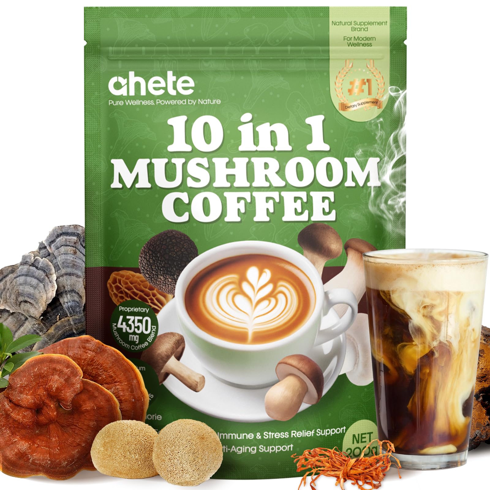 Ahete 10-in-1 Mushroom Coffee with Organic Arabica Lion s Mane Chaga Reishi & Cordyceps 2000mg Mushroom Blend Focus Energy & Immune Support Low Calorie Sugar-Free Keto Friendly 40 Servings