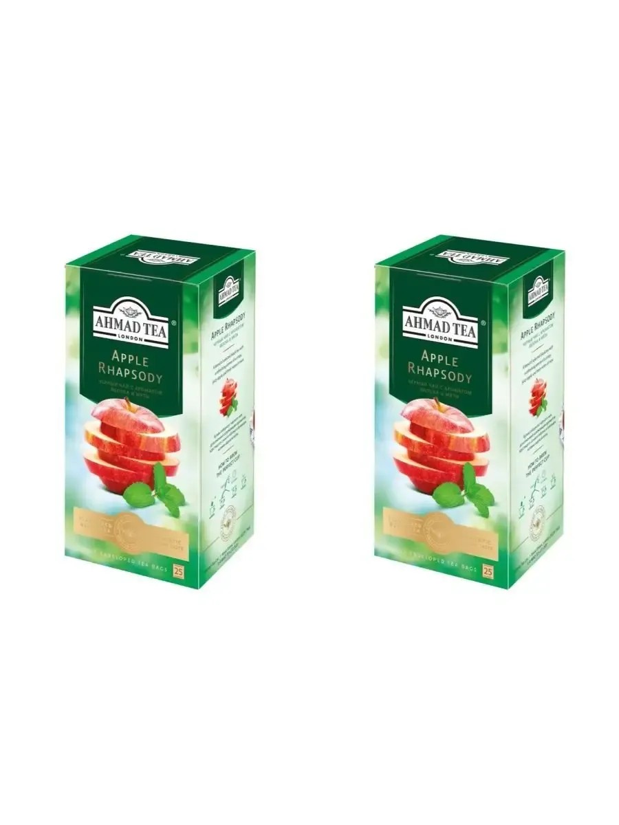 Ahmad Tea, Apple Rhapsodi чай черный с мятой и яблоком. В комплекте 2 упаковки по 25 пакетиков. Купаж отборного черного чая, дополненный освежающим ароматом хрустящего сочного яблока и пряными нотами садовой мяты. Apple Rhapsody, яркость незабываемых мгновений счастья, сладость минутных слабостей и легкость принятия важных решений.