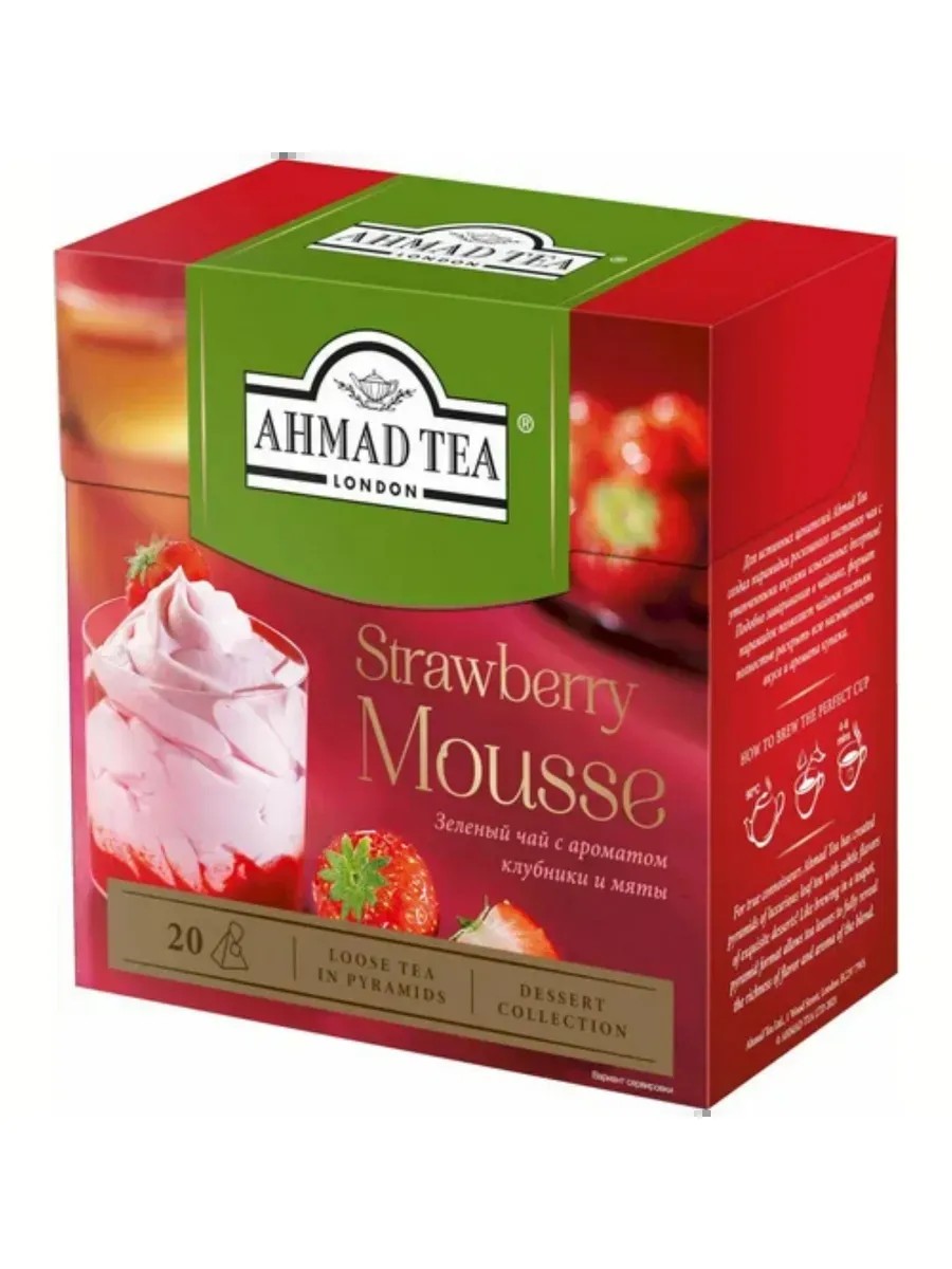 Клубничный мусс от Ahmad Tea - бленд, который раскрывает новые грани совершенства чая: непревзойденное сочетание благородного китайского зеленого чая с ароматом сладкой клубники и нотой мятной свежести.