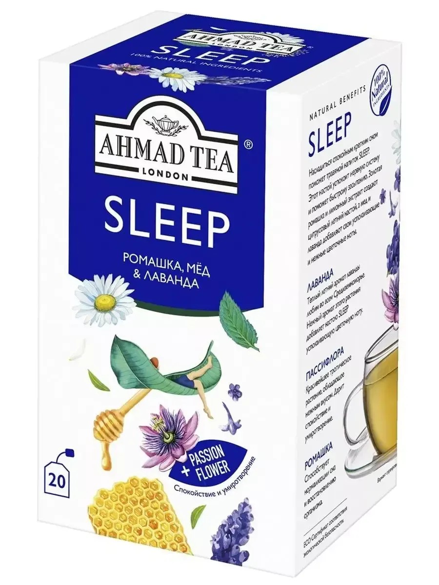 Ahmad Tea чайный напиток ромашка мёд и лаванда, 20 пакетиков по 1,5 гр. В комплекте 1 упаковка. Сон — проблемы со сном могут значительно повлиять на качество вашей жизни. Тогда стоит попробовать смесь трав с успокаивающим эффектом. Аромат лаванды оказывает расслабляющее действие на организм, а пассифлора, благодаря своим расслабляющим свойствам, способствует засыпанию.Полностью натуральная смесь позволяет не только эффективно использовать часы, отведенные на сон, но и подготовить организм к стрессу и напряжению, которые сопровождают нас каждый день.