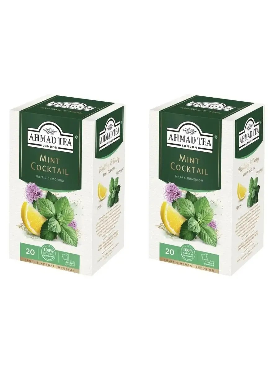 Ahmad Tea, Травяная коллекция Mint Cocktail, мята с лимоном. В комплекте 2 упаковки по 20 пакетиков. В Древней Греции на основе мяты составляли парфюмерные композиции, уже тогда было известно, что даже аромат мяты исключительно благоприятно влияет на настроение. Mint Cocktail от Ahmad Tea - травяной чай на основе нежной мяты, с добавлением острой лимонной нотки, создаст гармоничную атмосферу на любой встрече.