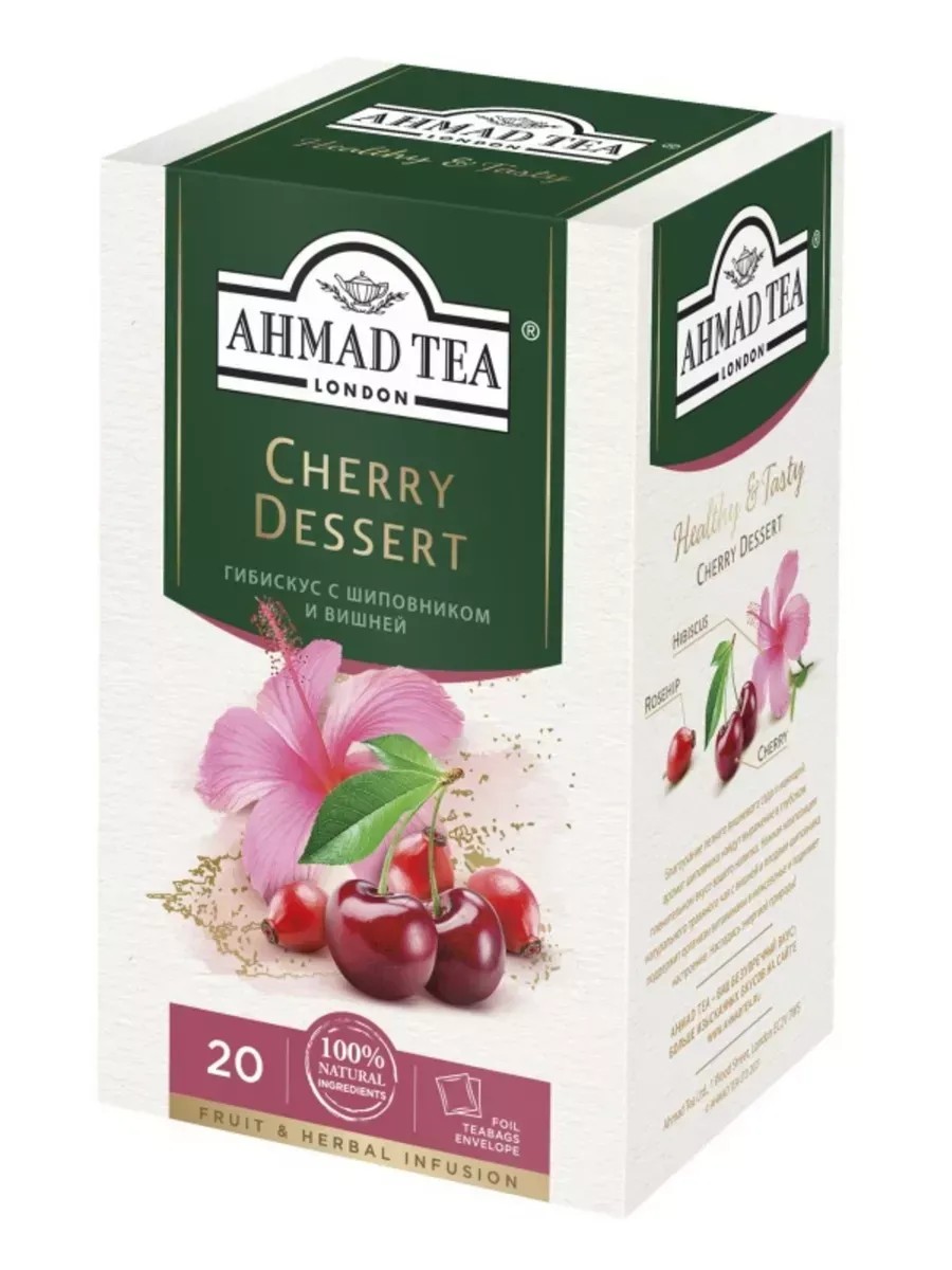 Herbal tea with cherry and rose hips Cherry Dessert is a bright bouquet of summer flavors, sun and health. Rose hips, called the healing orange of the North, enrich the body with vitamin C and strengthen the protective qualities of the immune system. This delicate infusion composition from the Ahmad Tea Healthy&Tasty collection gives an aromatic drink with a slight sourness and cherry sweetness. Ingredients: rose hips, hibiscus, natural cherry flavoring, concentrated dry cherry juice.