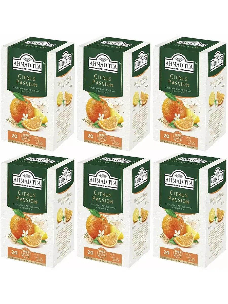Ahmad Tea Чай травяной, гибискус с апельсином и лимоном 20 пакетиков, 6 упаковок. Бодрящий купаж натуральных трав со вкусом и ароматом апельсина и лимона освежит и наполнит организм энергией в любое время дня. А плоды шиповника, кусочки яблок и листья ежевики укрепят организм. Насладись энергией природы. Citrus Passion - терпкий вкус апельсина в сочетании с томным шиповником и лимонной нотой создают пикантный освежающий напиток. Тип упаковки: картонная. Способ приготовления: заваривать 3-5 минут, температура воды 100°С. Хранить в сухом помещении при относительной влажности воздуха не более 70%.