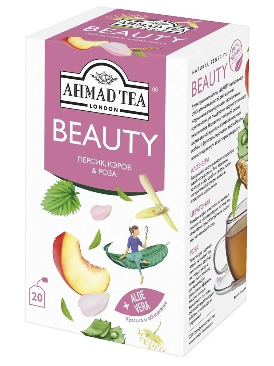 Ahmad Tea чайный напиток, персик, кэроб и роза. В комплекте 1 упаковка, в упаковке 20 пакетиков. Купаж травяного напитка «BEAUTY» представляет собой утонченный настой, обогащенный натуральными стимулирующими растительными компонентами для поддержания здорового и свежего внешнего вида. Насладитесь этой яркой смесью листьев зеленой крапивы и ароматной лимонной вербены с фруктовым, персиковым вкусом. Напиток поможет подчеркнуть вашу природную красоту. Зародившийся на юге Аравийского полуострова, вязкий нектар растений Алоэ Вера веками почитался за свои целебные свойства. Листья этого растения благотворно влияют на поддержание здоровья кожи. ЦЕРАТОНИЯ-Рожковое дерево известно за его кудрявые, похожие на горошину стручки, которые при обжаривании придают натуральный сладкий вкус, напоминающий какао. Лепестки роз с древних времен используют при изготовлении целебных настоев для ухода за кожей. Лепестки этого растения богаты уникальными эфирными маслами, которые выравнивают тон кожи, оказывают подтягивающее действие и избавляют от покраснений.