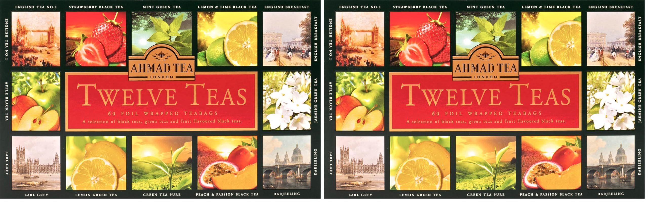 Ahmad Tea Twelve Teas - Assortiment de 12 types de th noir et de th vert aux saveurs diff rentes - 60 sachets de th emball s individuellement scell s avec ar me et avec ruban 120g de th Pack of 2