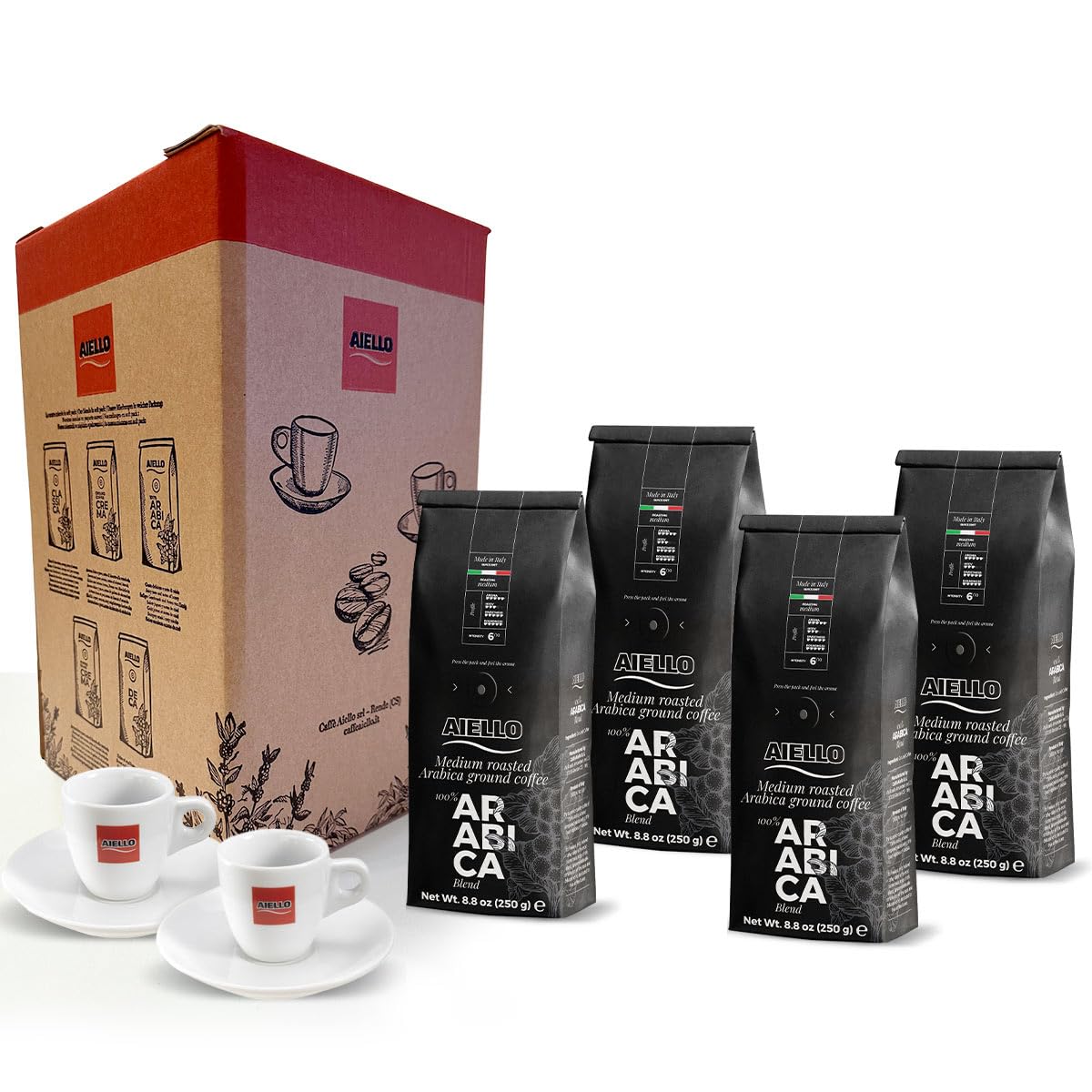Aiello Cafe Aiello Special Box 4 x 250 g Soft Pack 100% Arabic Medium Roast in a Protective Atmosphere with Freshness Protection Valve + Pairs of Cups with Saucers Made of