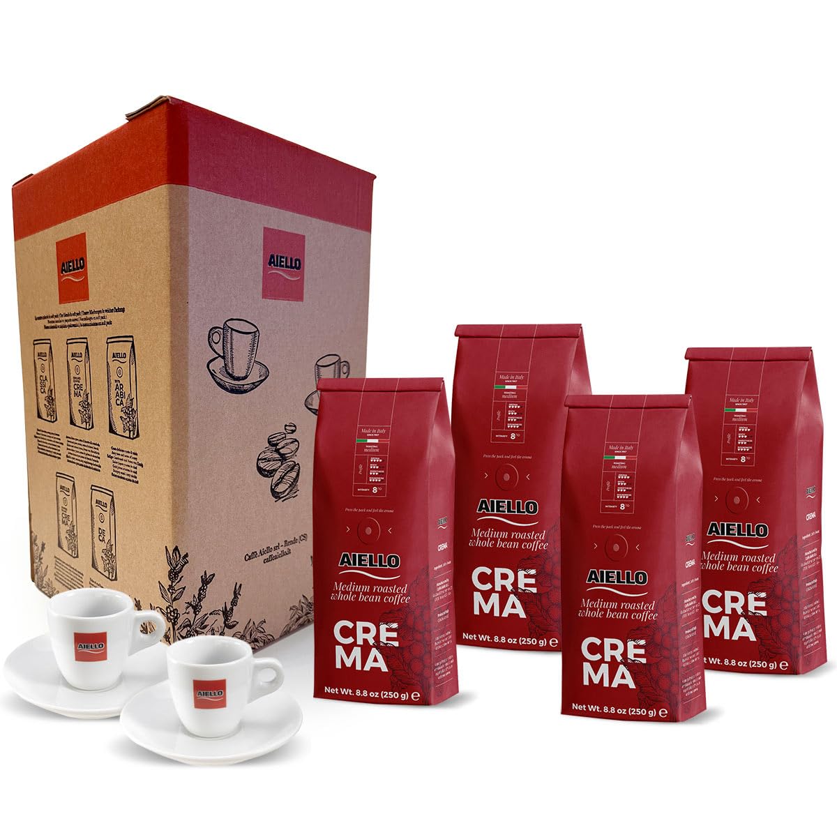 Aiello Cafe Aiello Special Box 4 x 250g Soft Pack cream beans medium roast in a protective atmosphere with a rescue valve and a pair of hard-paste porcelain cups and saucers