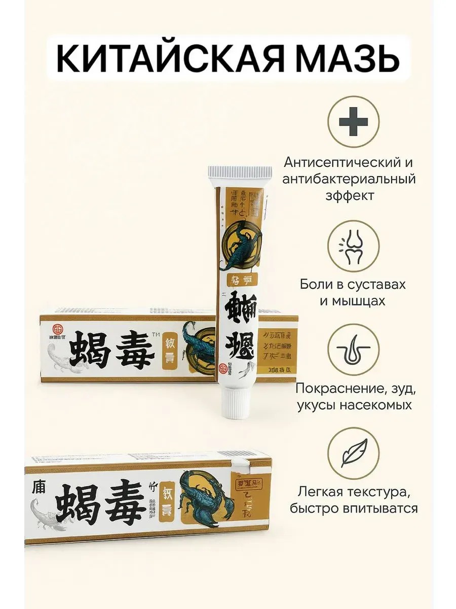 Китайская мазь со скорпионом — универсальное средство для наружного применения, которое помогает при самых разных проблемах. Мазь используется как мазь от боли в мышцах и суставах, средство для ухода за кожей и натуральный бальзам при ушибах, растяжениях, воспалениях и раздражениях.